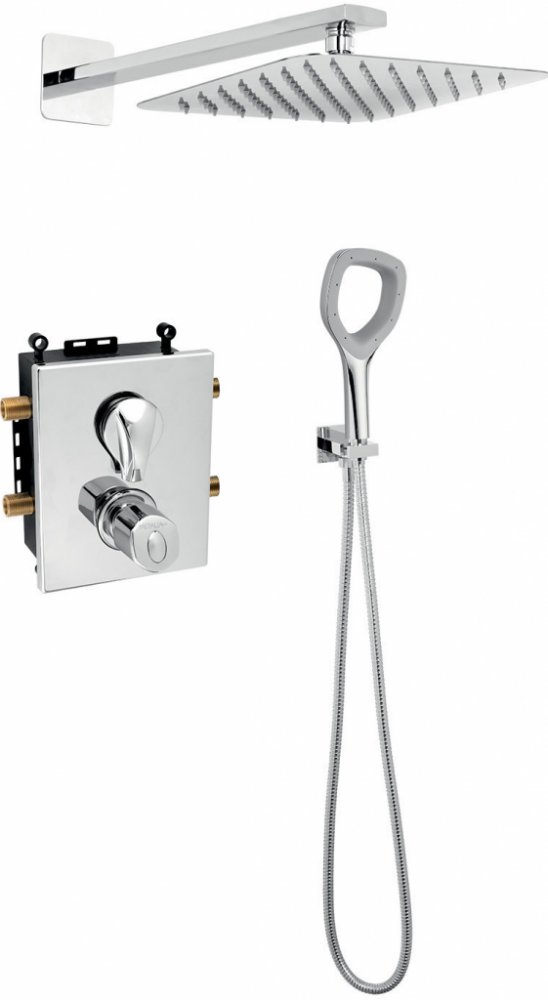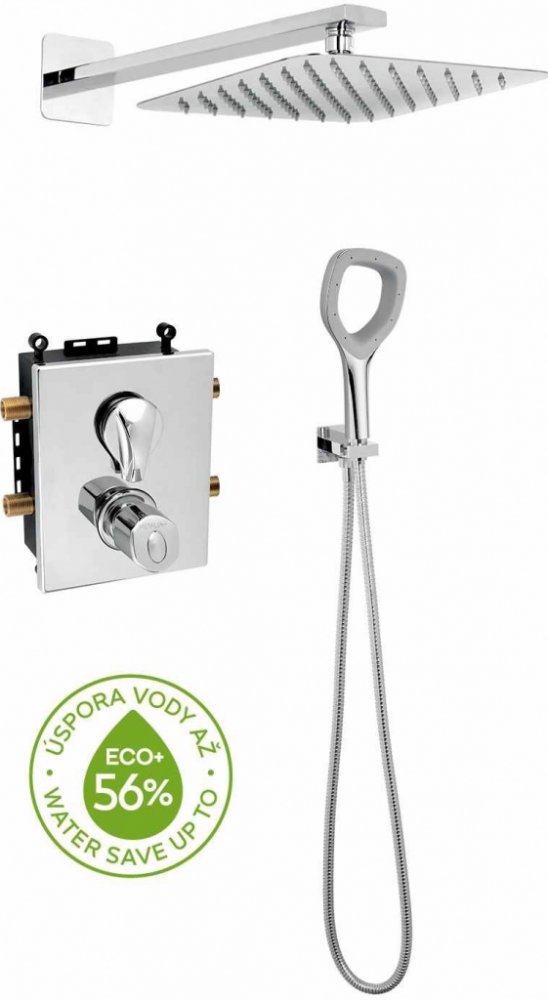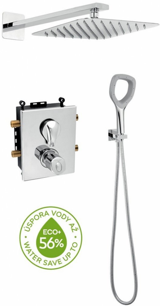 Termostatická sprchová podomítková sada s příslušenstvím. Box je dodávaný komplet včetně krytu a ovládací páky. Sada obsahuje podomítkovou sprchovou baterii s termostatickou kartuší KEROX s prodlouženou zárukou 7 let, hadici 150 cm, hlavovou sprchu v rozměru 250x250 mm, úspornou ruční sprchu a hranatý stěnový vývod vody s držákem na ruční sprchu.