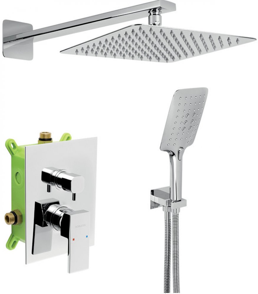 Sprchová podomítková sada s příslušenstvím. Box je dodávaný komplet včetně krytu a ovládací páky. Sada obsahuje podomítkovou sprchovou baterii s kvalitní keramickou kartuší s prodlouženou zárukou 5 let a keramickým přepínačem, kovovou hadici 150 cm, ramínko ze zdi v délce 400 mm, hlavovou sprchu ve SLIM designu v rozměru 250 x 250 mm, úspornou ruční sprchu a hranatý stěnový vývod vody s držákem na...