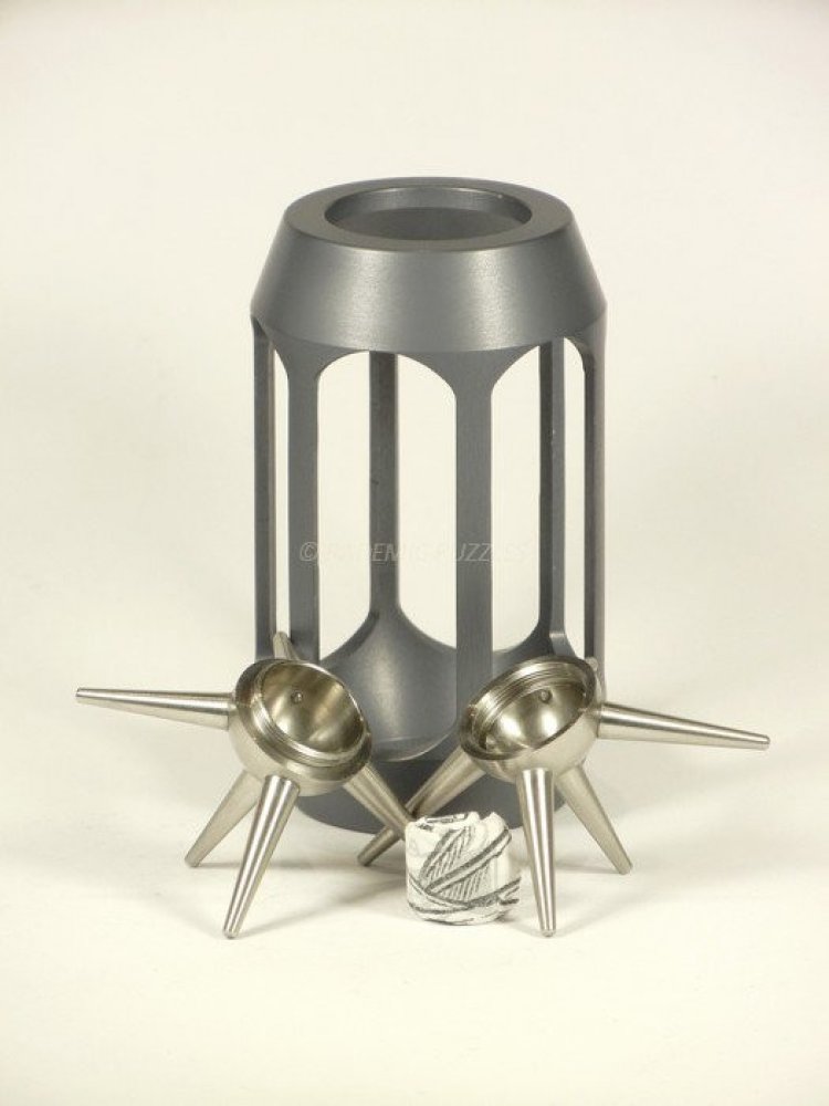 obtížnost 1-5: **** výrobce : ČR, RADEMIC PUZZLES rozměry : 47 x 80 mm materiál : kov – eloxovaný dural, nerez hmotnost : cca 84g počet ostnů : 10 Hlavolam je věrohodným ztvárněním Ježka z novodobé stínadelské trilogie. Radek Micopulos zhmotnil tento model přesně dle kreseb pana Jiřího Gruse. Historicky jde o první spolupráci současného ilustrátora a designéra tohoto hlavolamu. Klec má netradičně 6 otvorů a je vyrobena z jednoho kusu duralu v exkluzivním tmavě šedém odstínu. Uvnitř klece je rozšroubovatelný nerezový ježek s deseti kuželovitými ostny. Jeden osten je nejdelší. Obtí