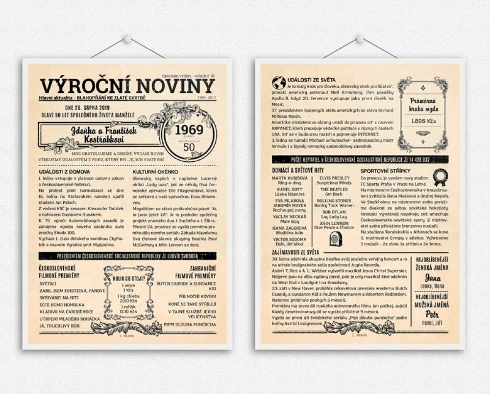 Dvoustranné výroční noviny 1969 k 55. výročí svatby se skutečnými událostmi z roku 1969. Vepíši jména oslavenců i gratulaci podle vašeho přání, zapracuji fotografii, pokud chcete. Rozměr každé stránky je A4 nebo A3.