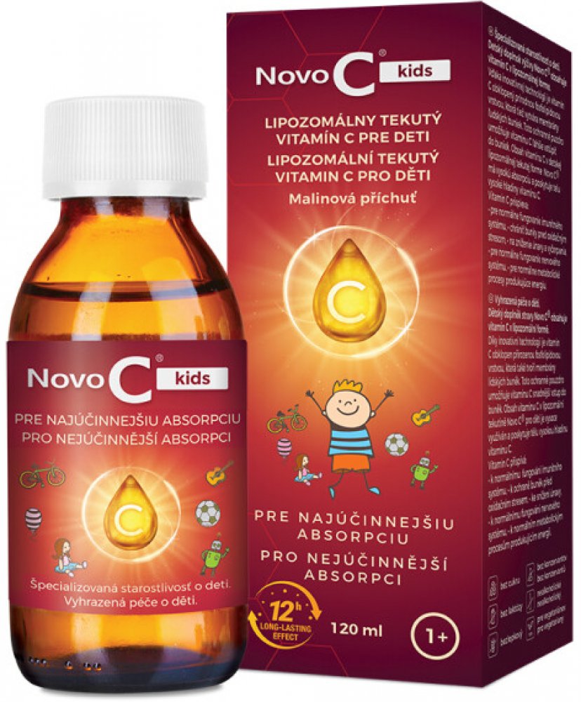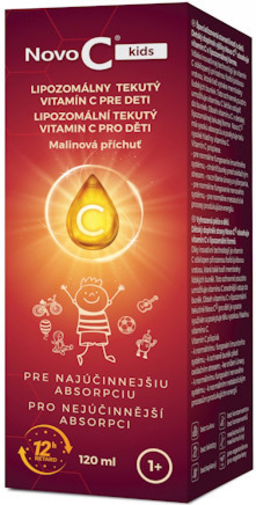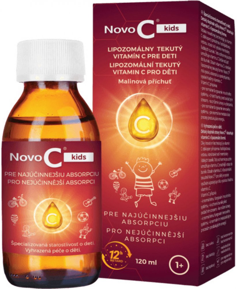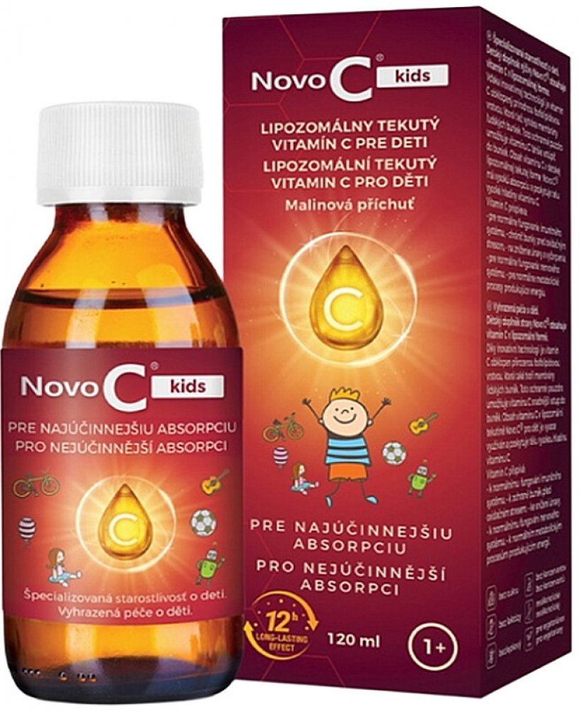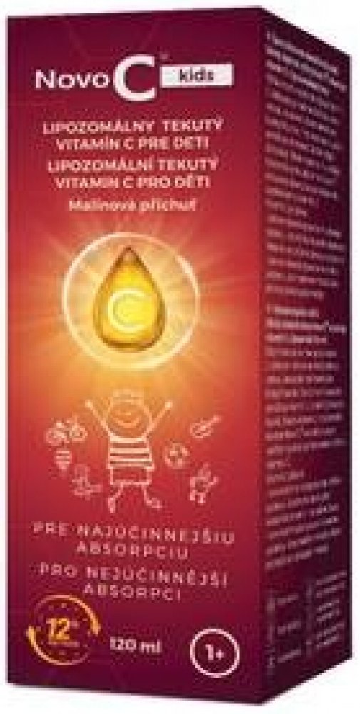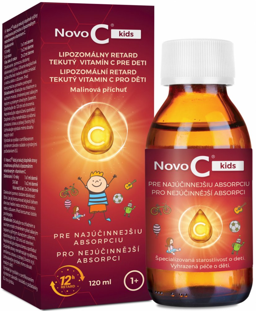 Specializovaná péče o děti. Dětský doplněk výživy Novo C® kids obsahuje vitamín C v lipozomální formě. Díky inovativní technologii je vitamín C obklopen přírodní fosfolipidovou vrstvou, která také vytváří membrány lidských buněk. Toto ochranné pouzdro umožňuje vitamínu C snáze vstoupit do buněk. Obsah vitamínu C v dětské lipozomální tekuté formě Novo C® kids má vysokou absorpci a poskytuje tělu vysoké hladiny vitamínu C. Vitamin C přispívá: