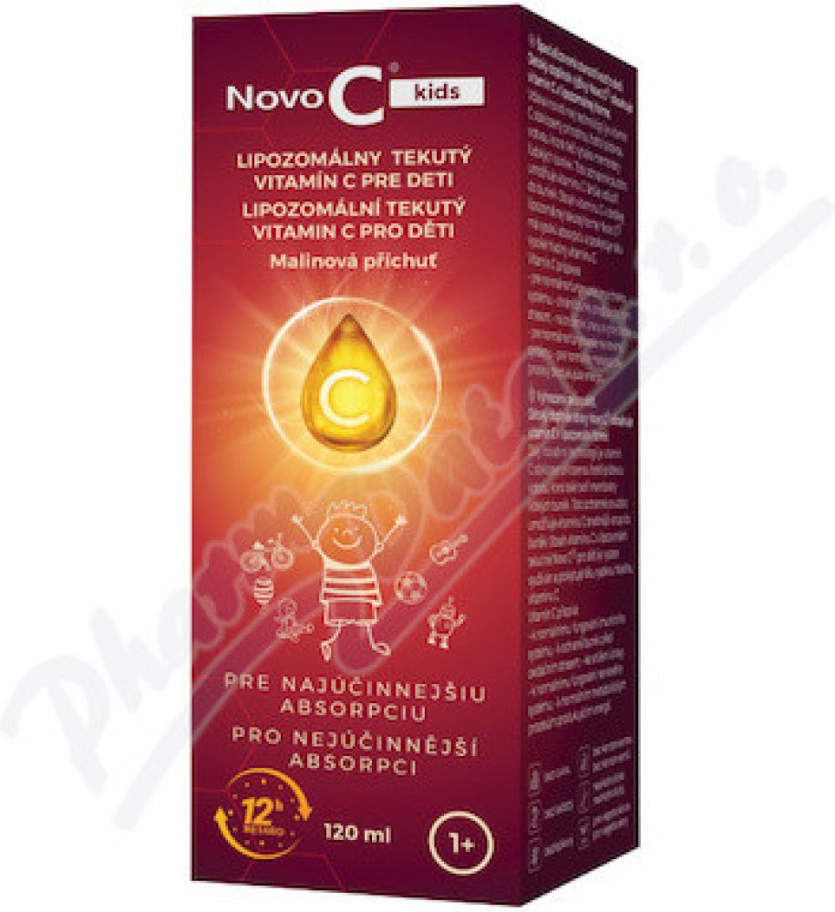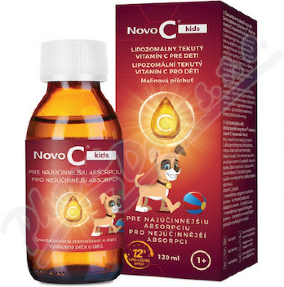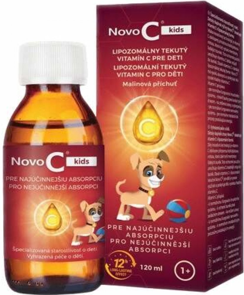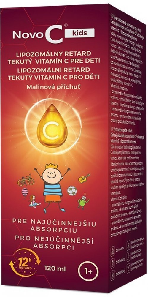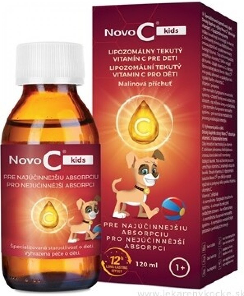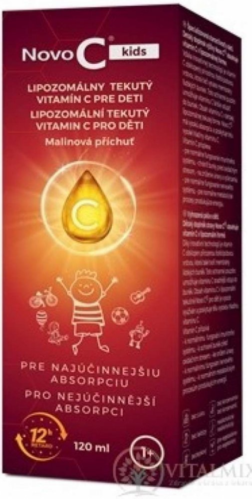 Specializovaná péče o děti. Dětský doplněk výživy Novo C® kids obsahuje vitamín C v lipozomální formě. Díky inovativní technologii je vitamín C obklopen přírodní fosfolipidovou vrstvou, která také vytváří membrány lidských buněk. Toto ochranné pouzdro umožňuje vitamínu C snáze vstoupit do buněk. Obsah vitamínu C v dětské lipozomální tekuté formě Novo C® kids má vysokou absorpci a poskytuje tělu vysoké hladiny vitamínu C. Vitamin C přispívá: