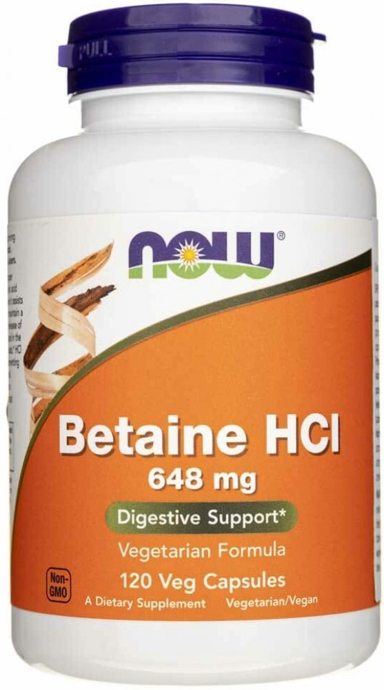 NOW Betaine HCl ve složení vhodném pro vegetariány obsahuje rostlinnou proteázu stabilní v kyselém prostředí s účinností rovnocennou živočišnému pepsinu.