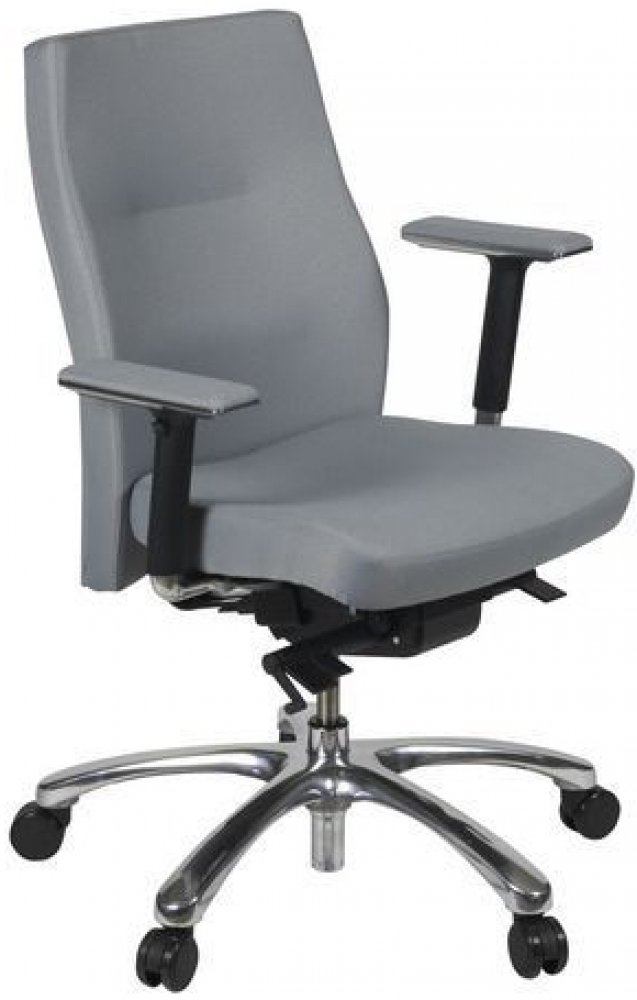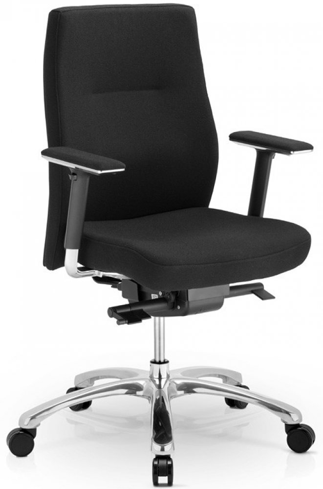 Kancelářská židle série Orlando s ergonomicky tvarovaným a čalouněným opěradlem po obou stranách,V nabízené verzi 24/7 má židle speciálně vyztužené prvky a také potahy s velmi vysokým indexem otěru,Sedák a opěradlo je čalouněné velice odolným potahem FLAX v černé barvě.Židle má nastavitelnou hloubku sedáku(vzdálenost od opěradla)a také nastavitelnou výšku opěradla,Židle mánastavitelné loketní opěrky, které jsou díky použitému materiálu velice komfortní,Ergonomické polohování předloktí (90 stupňů k trupu) významně uvolňuje zádové svaly při dlouhé práci v sedě,Základna židle je z leštěného hliníku - dostupná v chrómové barvě.Židle je standardně vybavenaměkkými kolečky, které se hodí převážně na dřevěné povrchy a také koberce,Židle je vybavena mechanismem Epron Syncron Plus s nastavením hloubky sedáku ESPT:- umožňuje houpání židle,- opěradlo se naklání synchronně se sedákem v poměru 2:1 a současně zaručuje uzamčení opěradla v pěti pozicích,- nastavení síly odporu opěradla (odpor, který