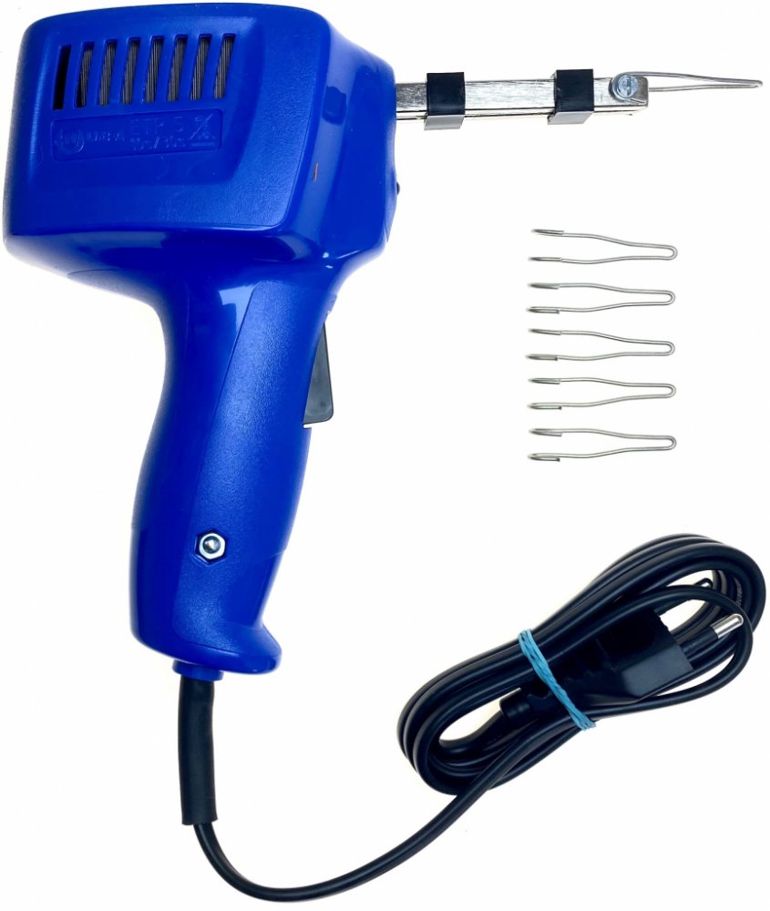 Transformátorová páječka NUBA ETP 5, uchycení hrotu speciálním upínačem, modrá barva.