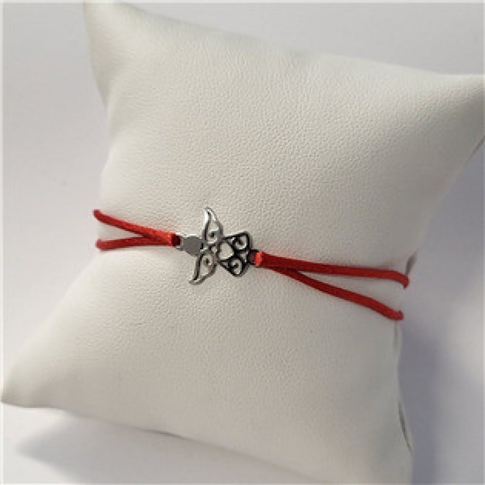 Červený textilní náramek dekorovaný stříbrným přívěskem s motivem andělíčka. Ozdobný prvek je pokoven vrstvou rhodia, která chrání stříbro před nežádoucím černáním.
