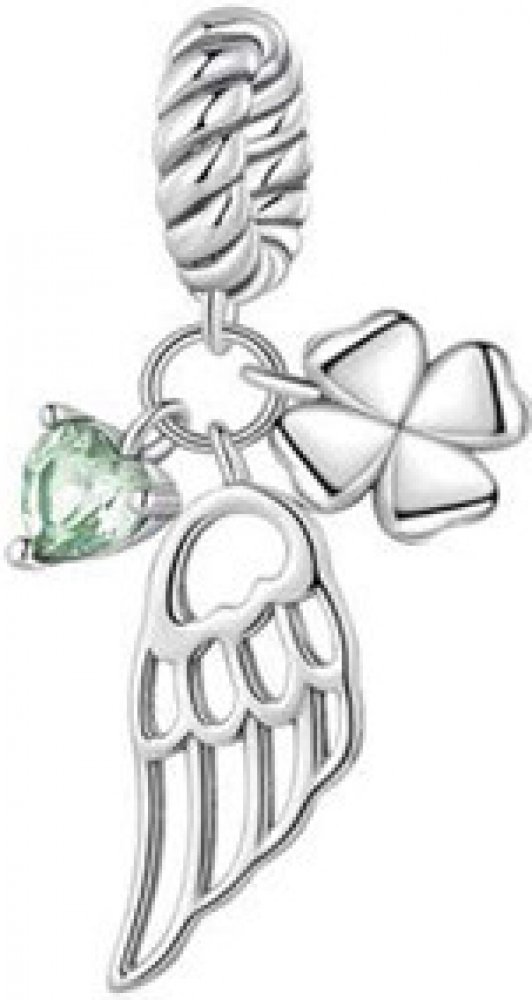 Stříbrný přívěšek korálek na náramek s přívěsky v podobě čtyřlístku, křídla a srdíčka se zeleným zirkonem.
