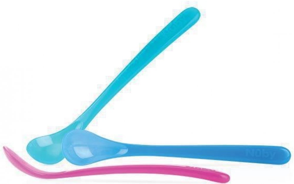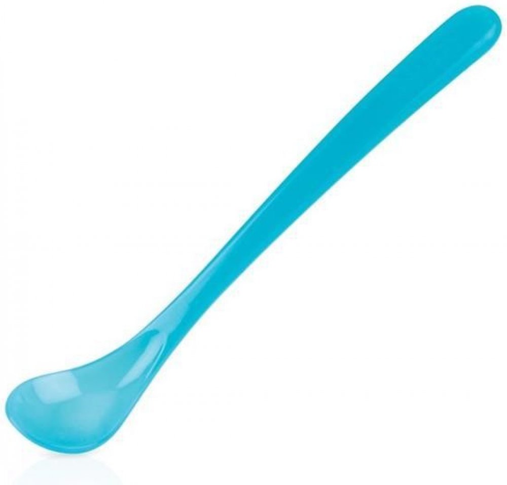 Lžička s dlouhou rukojetí a indikátorem tepla pro usnadnění krmení.