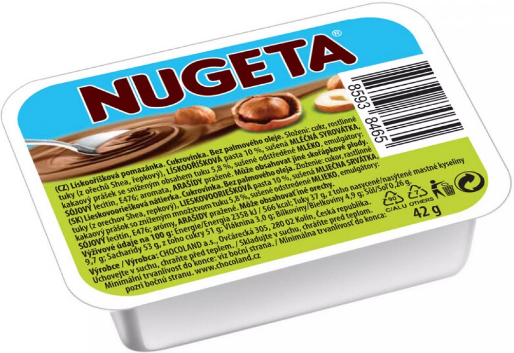 Výtečná lískooříšková pomazánka NUGETA bez palmového oleje v malém balení, ideálním na svačinuSložení: cukr, rostlinné tuky (z ořechů Shea, řepkový), lískooříšková pasta (10 %), sušená mléčná syrovátka, kakaový prášek se sníženým obsahem tuku (5,8 %), sušené odstředěné mléko, emulgátory: sójový lecitin, E476; aromata, arašídy pražené.Může obsahovat jiné skořápkové plody.