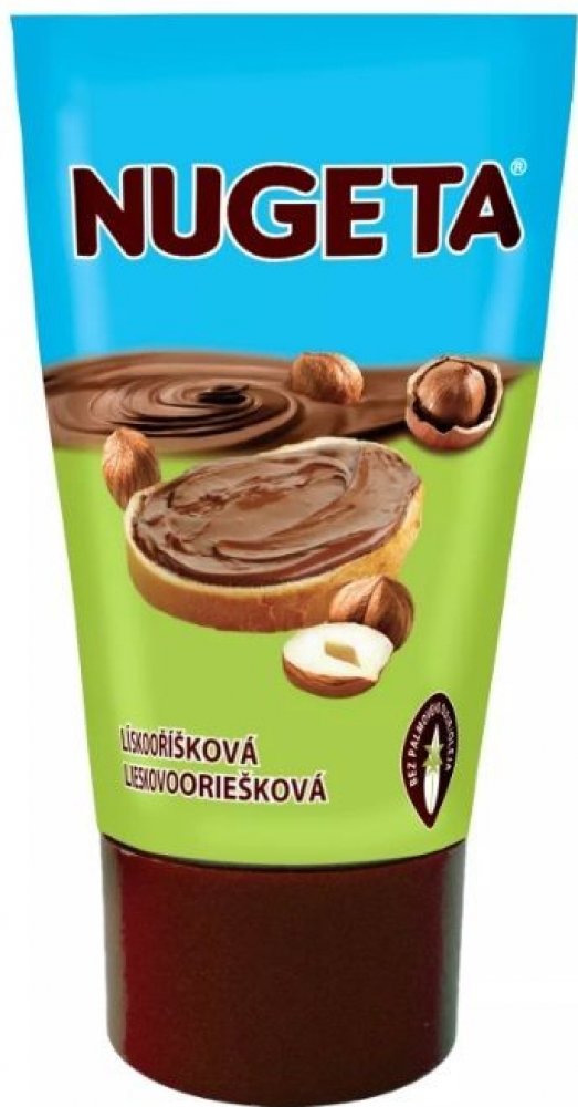 Jedinečná lískooříšková pomazánka Nugeta v malém balení.SloženíCukr, rostlinné tuky (z ořechů Shea, řepkový), lískooříšková pasta 10, sušenámléčná syrovátka, kakaový prášek se sníženým obsahem tuku 5,8, sušené odstředěné mléko, emulgátory: sójový lecitin, E476, aromata, arašídy pražené. Může obsahovat jiné skořápkové plody.Může obsahovat ořechy a sóju.Alergeny jsou označeny tučným písmem.Nutriční hodnoty na 100 g výrobkuEnergie 2358 kJ / 566 kcalTuky 37 gz toho nasycené mastné kyseliny 9,7 gSacharidy 53 gz toho cukry 51 gBílkoviny 4,9 gSůl 0,26 gInformace o produktuPůvodČeská republikaSkladování a použitíSkladováníUchovejte v suchu, chraňte před teplem.Název a SídloAdresa výrobceNestlé Česko s.r.o.Mezi Vodami 2035/31143 20 Praha 4