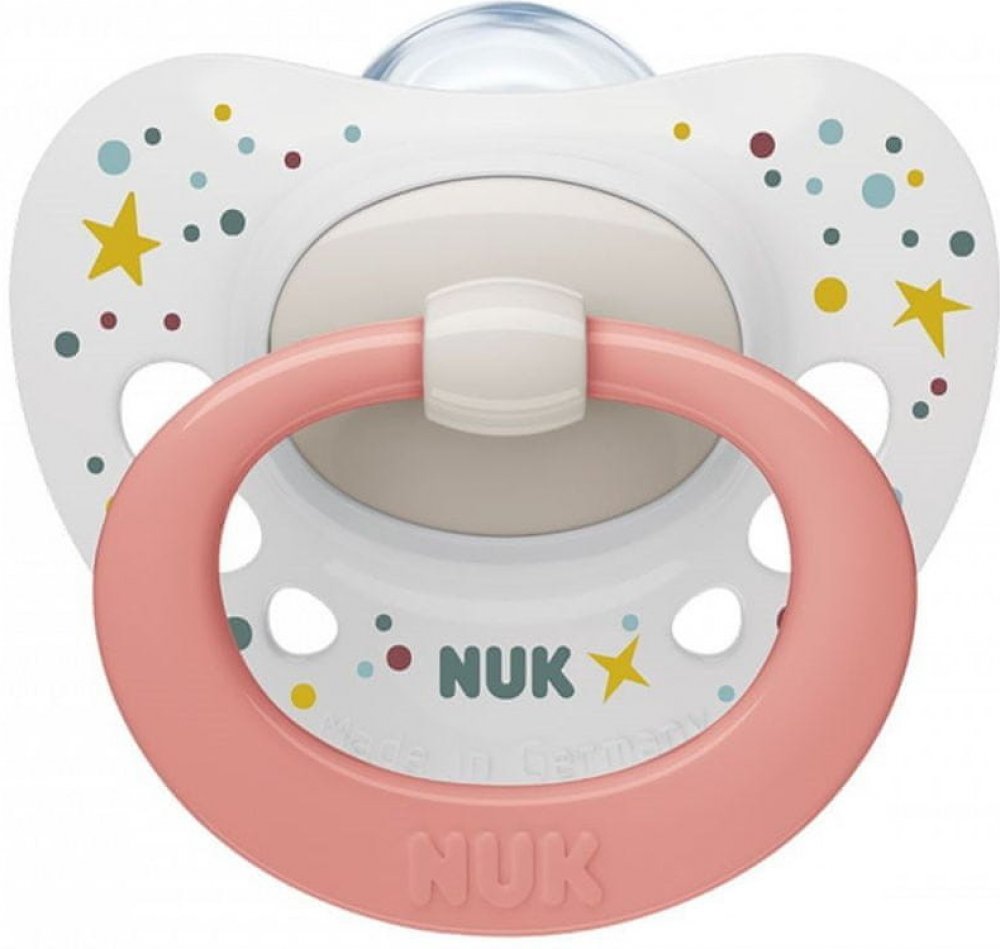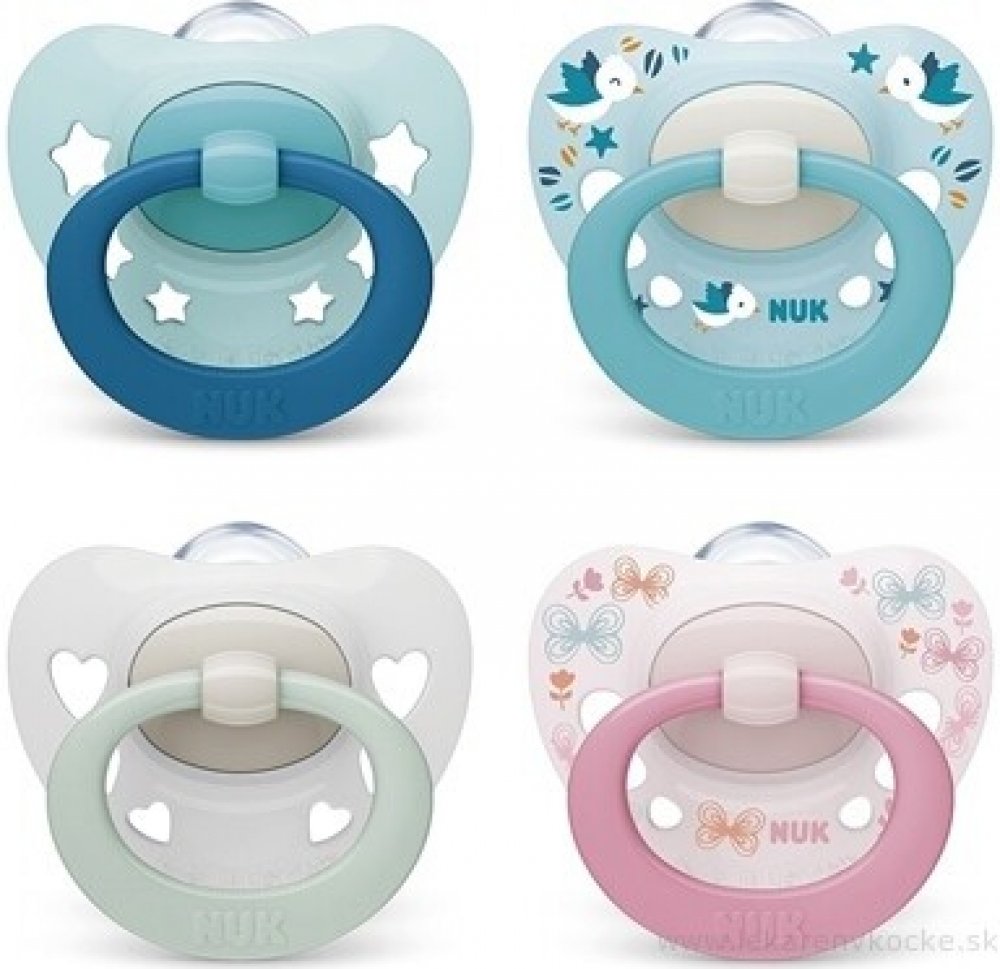 Kojenecký dudlík NUK Signature 0-6 měsíců. Dudlík má krásný barevný obrázek. Ortodontický tvar podporuje vývoj celé ústní dutiny dítěte. Dudlík je vylepšený a má ještě plošší tvar. Tenký a úzký krček savičky – snižuje tlak na čelist a zoubky. Je vyroben z vysoce kvalitního plastu a silikonového dudlíku.