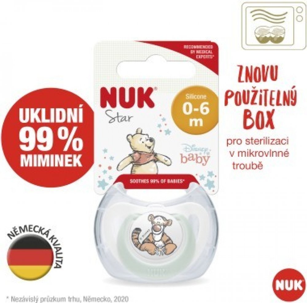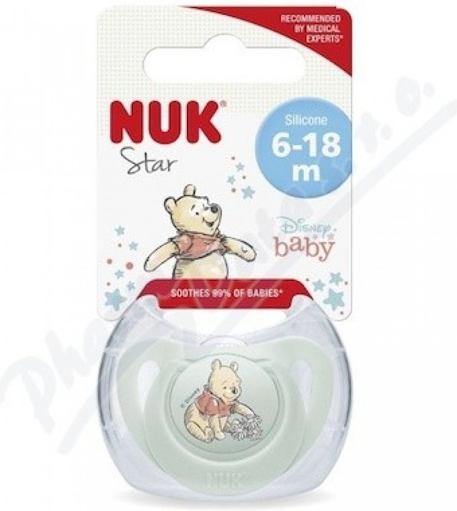 NUK Disney Medvídek Pú silikonový dudlík pro správný vývoj ústní dutiny dítěte, věk 6-18 měsíců, 1 ks v balení.