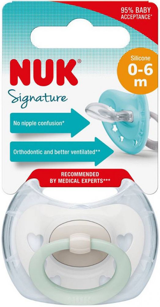 "NUK Signature silikonový dudlík pro správný vývoj ústní dutiny dítěte, věk 0–6 měsíců, 1 ks box - Vylepšený tvar dudlíku NUK – dudlík má stejný tvar jako matčina bradavka při kojení, dokonale padne do úst dítěte při sání - Díky užšímu a ploššímu tvaru sací části se tlak na zuby a čelisti - Plochá sací část a hladká spodní strana přinášejí dítěti příjemný pocit a podporují tak přirozené sání - Odo...