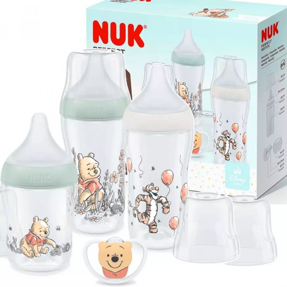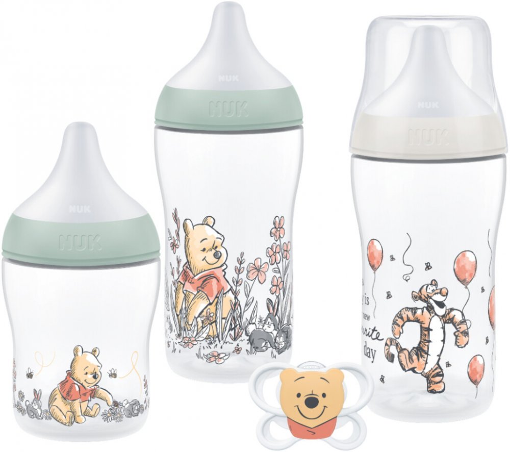 Sada NUK Perfect Match Disney Medvídek Pú s měkkou silikonovou savičkou a antikolikovým systémem, součástí dudlík NUK Perfect Match Air 0-6 měsíců pro pohodový start od narození, neobsahuje BPA Sada NUK Perfect Match Disney Medvídek Pú s měkkou silikonovou savičkou a antikolikovým systémem, součástí dudlík NUK Perfect Match Air 0-6 měsíců pro pohodový start od narození, neobsahuje BPA.- 3× kojenecká láhev NUK Perfect Match s patentovaným indikátorem kontroly teploty, jedna láhev o objemu 150 ml ve velikosti S (od 0 měsíců pro mateřské mléko), dvě láhve o objemu 260 ml ve velikosti M (od 3 měsíců pro umělé kojenecké mléko), lze kombinovat se všemi doplňky odsávaček NUK Perfect Match a NUK Soft&Easy- Navíc 1× silikonový dudlík NUK Perfect Match Air Disney Medvídek Pú 0-6 měsíců Medvídek Pú a jeho kamarádi ve výrobkové řadě NUK- Veselý Medvídek Pú, stále oblíbenější postavička, nyní zdobí výrobky v řadě NUK svými roztomilými motivy. Na vzrušující cestě do světa výrobků NUK ho doprovází jeho kamarád Tygr. S odvahou, zvědavostí, a především přátelstvím zvládnou Medvídek Pú a jeho kamarádi každé vzrušující dobrodružství. Objevte tuto kolekci právě teď!NUK Perfect Match – láhev, která se přizpůsobí miminku- Láhev NUK Perfect Match je bezpečnou volbou při výběru základní výbavy pro péči o novorozence. Tato inovativní lahvička byla navržena tak, aby co nejvěrněji napodobovala pocit při kojení, a pomáhala tak usnadnit jemný přechod mezi kojením a krmením z lahve – pro miminko i rodiče.Měkká, široká opora rtů- Měkká a flexibilní savička je vyrobena ze silikonu podobného pokožce, který se přizpůsobuje přirozenému způsobu krmení dítěte. V kombinaci s měkkou a širokou oporou rtů podporuje instinktivní přisátí – ideální pro rodiny, které přecházejí z kojení na lahev a zpět, aniž by narušovaly krmení.Antikolikový ventil NUK- Osvědčený antikolikový systém NUK snižuje množství vzduchu, které miminko během krmení spolyká. Méně bublinek znamená méně bolení bříška, méně plynatosti a klidnější krmení – ideální pro novorozence a kojence citlivé na podráždění bříška.Doporučována zdravotníky a důvěryhodná v rodinách po celém světě – NUK je č. 1 v německých nemocnicích ve výživě kojenců*. Díky 98% přijetí miminky** dodává tato lahvička rodičům jistotu, že vybrali správně.Teplota na první pohled- Indikátor kontroly teploty je praktickým doplňkem – změní barvu, pokud je mléko příliš horké***, díky tomu máte jistotu, že je výživa správně ohřátá.Dudlík NUK Perfect Match Air silikonový: pro obzvláště citlivou pokožku miminkaDudlík NUK Perfect Match Air je speciálně navržen tak, aby miminko uklidnil a zároveň chránil jeho citlivou pokožku. Díky extra velkým ventilačním otvorům umožňuje maximální proudění vzduchu kolem úst, čímž pomáhá snižovat vlhkost a předcházet opruzeninám od slin – ideální volba pro miminka s citlivou pokožkou.Vyvinut a vyroben v Německu s ohledem na zdravý vývoj dutiny ústní. Ortodontický tvar podporuje zdravý vývoj zoubků a čelisti**** a zároveň minimalizuje tlak na patro a dásně – i díky tomu je dudlík oblíbenou a důvěryhodnou volbou pro rostoucí děti.Savička je vyrobena z měkkého, vysoce kvalitního silikonu a má promyšlený design: vrchní část je extra měkká, takže se jemně přizpůsobí tvaru patra dítěte, zatímco plochá spodní strana ponechává jazýčku dostatek prostoru pro přirozený pohyb. Podporuje tak zdravý sací reflex a dudlík působí miminku důvěrně a uklidňujícím dojmem – skvěle se hodí pro novorozence i starší miminka.*Výpočet vychází z počtu saviček prodaných nemocnicím prostřednictvím společnosti Newell Brands v porovnání se statistikami porodů a krmení; www.cdc.gov, www.statista.com** Nezávislý průzkum trhu, Německo 2023*** Před krmením prosím vždy zkontrolujte teplotu****Vědecká studie University of Minho v Portugalsku, srovnání 6 typů dudlíků, Pharmawissen aktuell, speciální vydání, 2022.