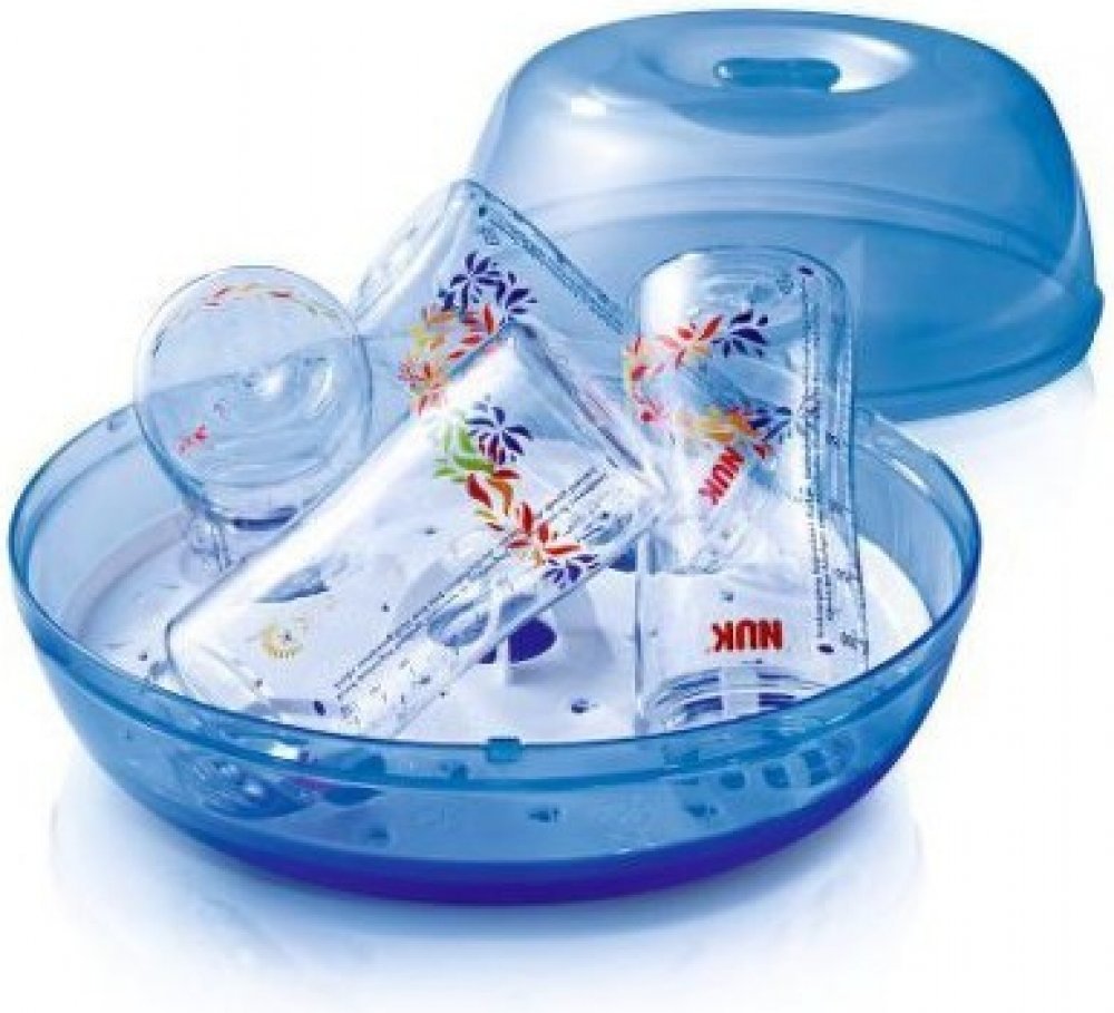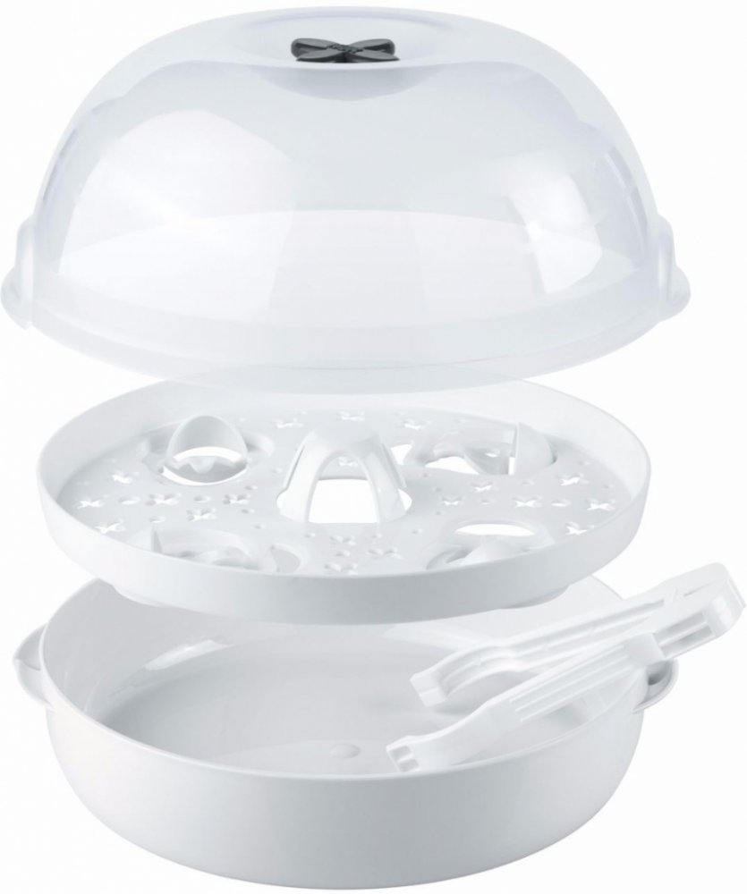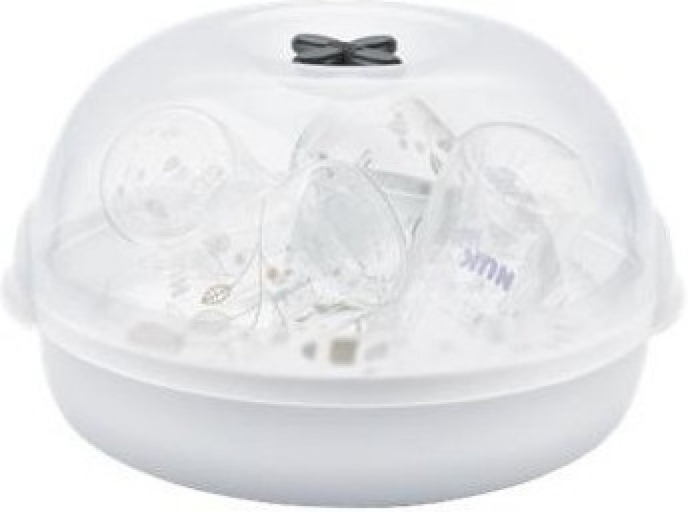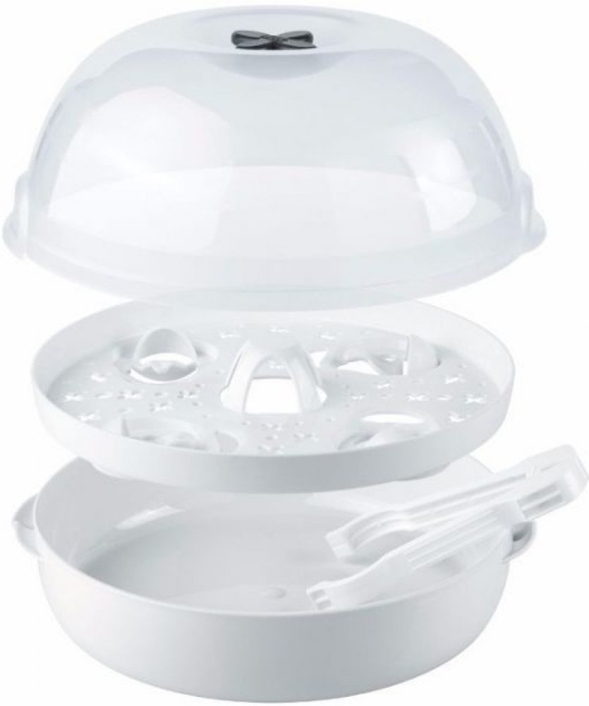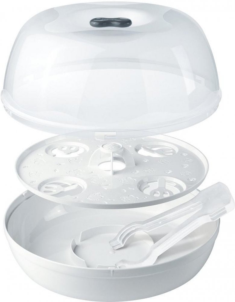 Současně je slučitelný a lze jej použít se standardními lahvemi všech tvarů a velikostí, pokud jsou z materiálu, který je možné vystavit působení mikrovlnného záření. Parní sterilizátor do mikrovlnné trouby se hodí pro láhve všech tvarů a velikostí, které jsou vyrobeny z materiálů vhodných pro mikrovlnné trouby. Má průhledné víko a nyní se nově dodává s blokovacím systémem. Po skončení sterilizace jej stačí otřít hadříkem, a pokud by potřeboval vyčištění, lze jej umývat i v myčce nádobí.