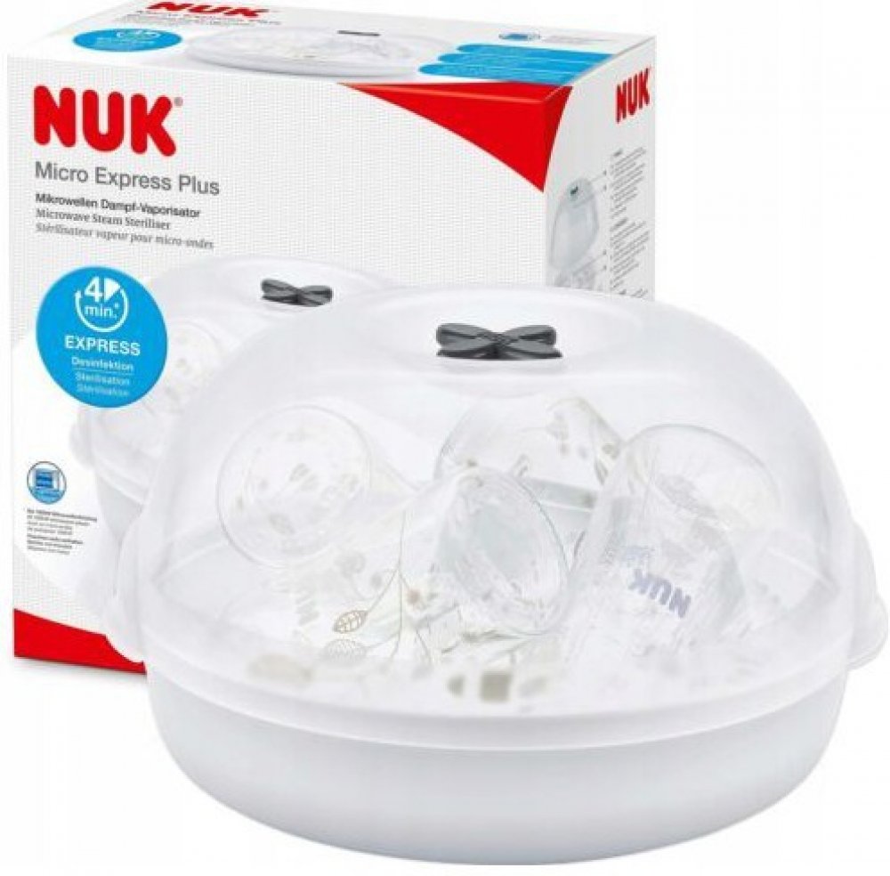 Parní sterilizátor do mikrovlnné trouby NUK Micro Express Plus má pouhé tři součásti, a proto je jeho použití snadné. Vejde se do každé standardní mikrovlnné trouby s minimálním vnitřním prostorem o výšce 187 mm a šířce a hloubce 280 mm.