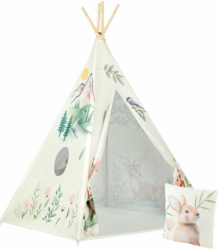 Praktické detaily zvyšují pohodlí při používání: všité podloží, kulaté okénko pro ještě zábavnější hru a silný polštář se vzorem králíčka, který je součástí balení. Teepee se snadno skládá a zabírá málo místa; po složení se dá jednoduše přenášet. Můžete ho postavit v dětském pokoji, ve společném obýváku jako herní koutek, a také na zahradě jako útočiště ve stínu před ostrým sluncem.