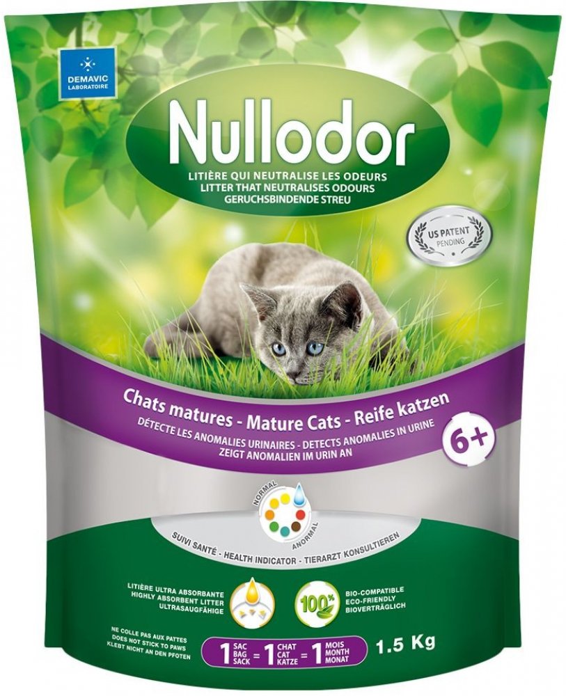 Kočkolit Nullodor Mature Cats je inovativní stelivo, které napomáhá rozpoznávat onemocnění močových cest a orgánů. Zejména starší kočky jsou náchylné k infekcím močových cest a tvorbě močových kamenů. Často se tyto nemoci identifikují až v pokročilém stádiu. Kočkolit Nullodor Mature Cats obsahuje indikátor nemocí, který reaguje na nestandardní jevy v moči např. krev, bilirubin, zásaditost či špatná hodnota pH. Lze tak předcházet závažným onemocněním. Nullodor Mature Cats je přírodní produkt vyrobený ze silikátového gelu a vody. Směs se pomalu zahřívá při vysokém tlaku po dobu několika dní. Za pomalého odpařování vody dochází k tvorbě mikropórů a mikrokapilár, které pohlcují vlhkost během několika sekund. Savost tak dosahuje až 150%! Vlhkost se odpařuje, zatímco pachy zůstanou uzavřeny uvnitř krystalů po dobu jednoho měsíce. Dochází tak k blokaci tvorby amoniaku. Antistatické stelivo se nelepí na tlapky a má prokazatelné antibakteriální účinky. Přednosti kočkolitu Nullodor Mature Cats: silikátové stelivo pro kočky od 6 let věku s indikátorem pro včasné rozpoznání infekcí a onemocnění stelivo se zabarví při nestandardních jevech v moči, např. krev, zásaditost, bilirubin nebo špatná pH hodnota ukazuje anomálie v moči umožňuje včasné rozpoznání a léčení infekcí a vážných onemocnění přírodní výrobek: vyroben ze silikátového gelu a vody extrémně vysoká savost: díky mikropórům a mikrokapilárám absorbuje vlhkost během několika sekund - míra absorpce až 150% pohlcuje pachy: pachy jsou uzavřeny uvnitř krystalků po dobu až 4 týdnů antistatické: nelepí se na tlapky bezprašné prokazatelný antibakteriální účinek: testované po dobu 26 dní na různé kmeny bakterií (Escherichia coli, Pseudomonas aeruginosa, Staphylococcus aureus)