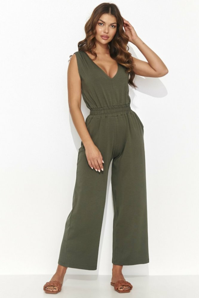 Dámský overal v odstínu khaki, jenž je kombinací elegance, ležérního stylu a komfortu. Měkký úplet krásně splývá, jemně obepíná postavu a díky elastickému pasu zvýrazňuje ženské křivky. Široká ramínka a rozšířené nohavice působí vzdušně a opticky prodlužují nohy. Praktické kapsy dodávají outfitu funkčnost, zatímco minimalistický střih umožňuje nekonečné kombinace – od sportovních sandálů po elegantní boty na klínku. Tento model je ideální pro ženy, které chtějí vypadat stylově a zároveň se cítit pohodlně i během teplých letních dnů. Tento overal se stane základem ležérní, ale sofistikované garderoby, ideální na dovolenou i městské dny.