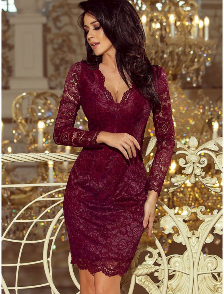 Společenské dámské šaty s dlouhým rukávem krajkové bordó