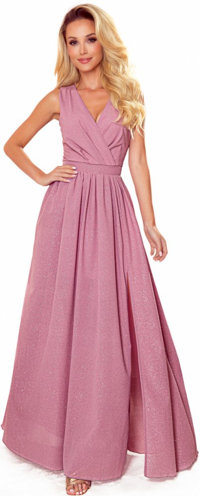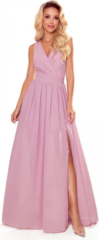 Justine - dlouhé šaty s výstřihem, rozparkem na nohavici a zavazováním na zádech. Vyrobeno ze vzdušného materiálu v pudrově růžové barvě. Zapínání vzadu na krytý zip. Polský výrobek. Značka Numoco.