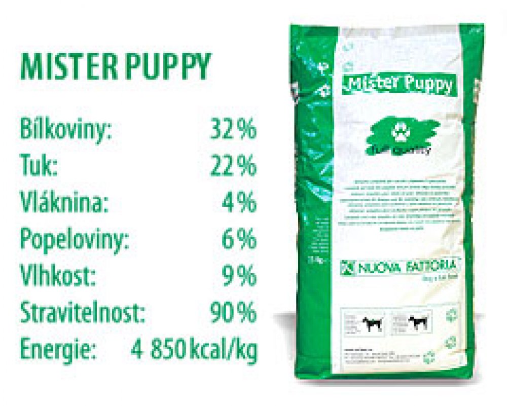 Nuova Fattoria pro štěňata pro všechna plemena s vysokou aktivitou vepřové Nuova Fattoria 4 kg prémiové suché Mister Puppy 32 % obiloviny nízká (<200 mg) 22 % 2 % 2.5 % 1 % 9 % není zaručeno standardní (<25%) standardní základní základní možné základní