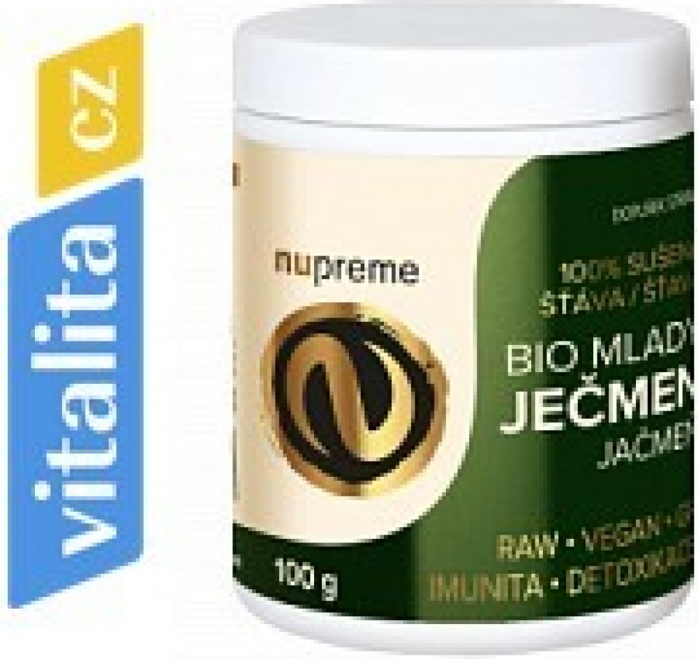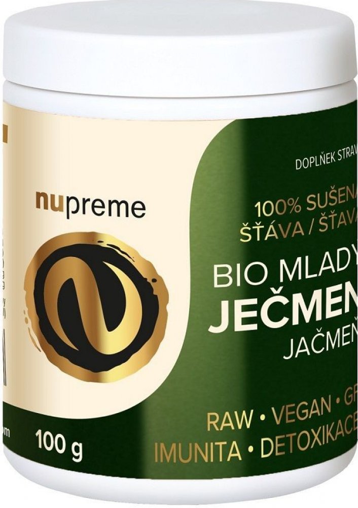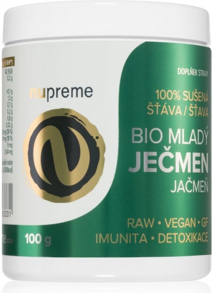 Doplněk stravy z prášku z mladého ječmene, který působí jako celkové tonikum vitaminů a minerálních doplňků z přírodního zdroje. Obsahuje vitaminy C a B6, které podporují imunitu a přispívají ke snížení míry únavy a vyčerpání. Díky minimálnímu obsahu travní vlákniny je možné tento produkt užívat dlouhodobě. Nupreme Mladý ječmen Premium BIO se vyrábí výhradně lisováním a následným sušením šťávy z v...