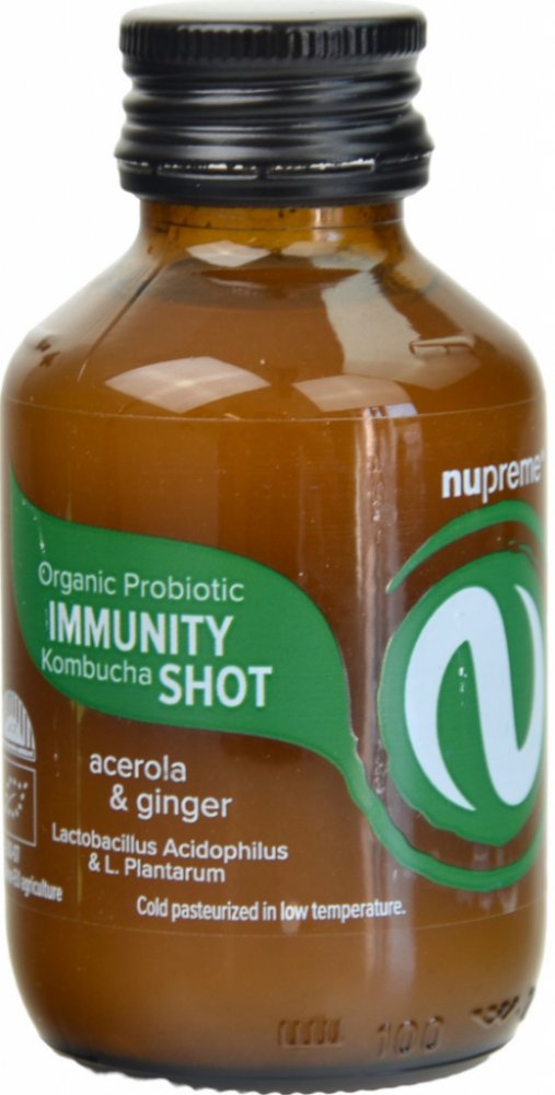 BIO Kombucha Immunity Shot je intenzivní funkční nápoj, který spojuje sílu koncentrovaného fermentátu z kombuchy, aceroly s vitamínem C a hřejivou hloubku zázvoru. V 100 ml se skrývá promyšlená kombinace, která podpoří imunitní systém i chuťové buňky. Základem shotu je koncentrovaný fermentát z kombuchy – bohatý extrakt získaný z tradičně fermentovaného čajového nápoje, který obsahuje bioaktivní složky vznikající během řízené fermentace. Dále je přidáno: BIO acerola – výjimečný přírodní zdroj vitamínu C, který přispívá k normální funkci imunitního systému a snížení míry únavy a vyčerpání. Vitamín C – kyselina L-askorbová.BIO zázvor – tradičně využívaný pro své zahřívací a stimulační účinky.BIO jablečná šťáva – lisovaná za studena, pro vyváženou a příjemnou chuť bez nutnosti doslazování.