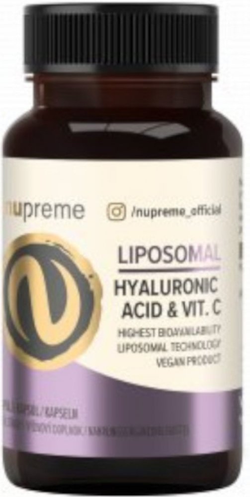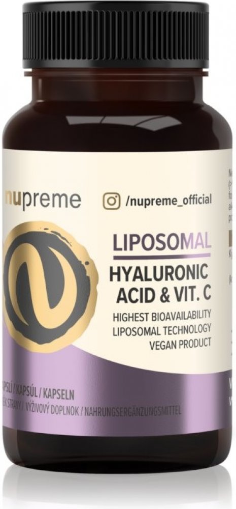 Doplněk stravy Nupreme Liposomal kyselina hyaluronová + Vitamin C obsahuje kyselinu hyaluronovou doplněnou vitaminem C v lipozomální formě. Tato forma zajišťuje maximální možnou vstřebatelnost a využitelnost obou účinných látek díky patentované technologii LIPOCELLTECH™. Kyselina hyaluronová se přirozeně vyskytuje ve všech živých organismech. J e součástí pojivových a pokožkových tkání v těle. Má schopnost na sebe vázat velké množství vody a zajišťuje tak hlubokou hydrataci a elasticitu pleti. V pojivové tkáni, kloubech a chrupavkách zastává funkci „mazadla“. S věkem její produkce postupně a později významně klesá. Vitamin C je potřebný pro tvorbu kolagenu pro normální funkci kostí, chrupavek a pokožky a pomáhá chránit buňky před oxidativním stresem.