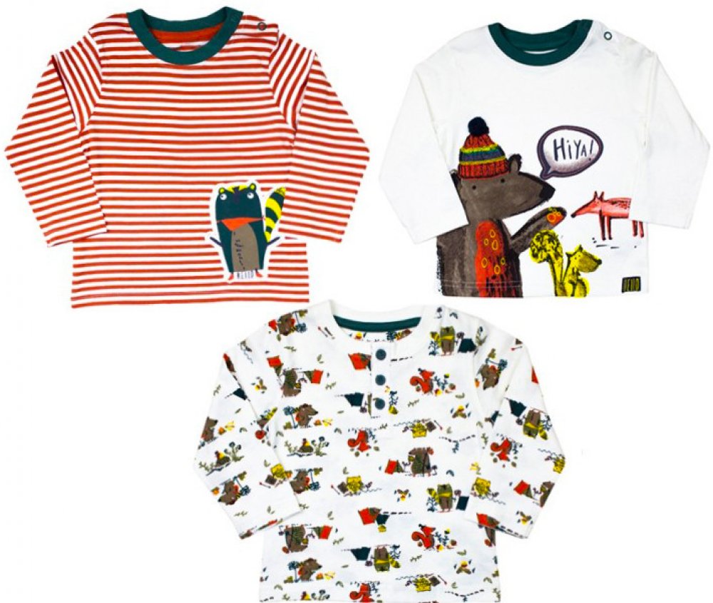 Nádherná sada tří kojeneckých triček Britské módní značky NUTMEG. Na tričkách jsou krásné nášivky a velice kvalitní potisk Jedná se o outletový výprodej (poškozený vnitřní štítek). Velikosti 0-2 roky.