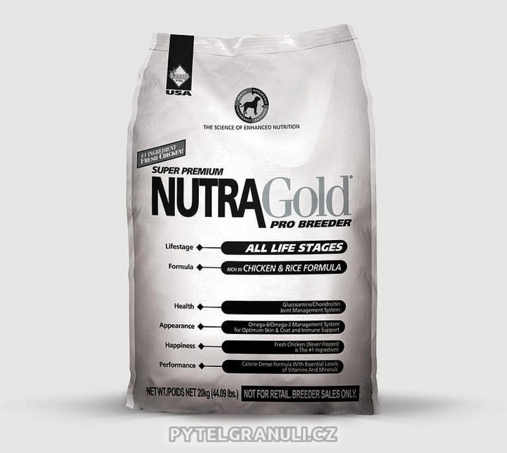 Nutra Gold pro juniory a dospělé pro všechna plemena pro březí / kojící feny kuřecí Nutra Gold 20 kg superprémiové suché Breeder 30 % Chovatelské balení vysoká (>500mg) 20 % 2 % 1.2 % 1 % 5.5 % 0.3 % standardní standardní (<25%) standardní základní pasivní (prebiotika) možné základní