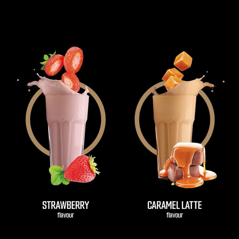 Karamel - latte: 80 % syrovátkový proteinový koncentrát (obsahuje slunečnicový lecitin a protispékavou látku fosforečnan vápenatý), 13,5 % syrovátkový proteinový izolát (obsahuje sójový lecitin), aroma, bezlepková pšeničná vláknina, stabilizátory akáciová a xanthanová guma, barvivo karamel, protispékavá látka oxid křemičitý, chlorid sodný, směs trávících enzymů Digezyme® (amyláza, proteáza, laktáza, lipáza a celuláza), sladidla sukralóza a steviol-glykosidy.