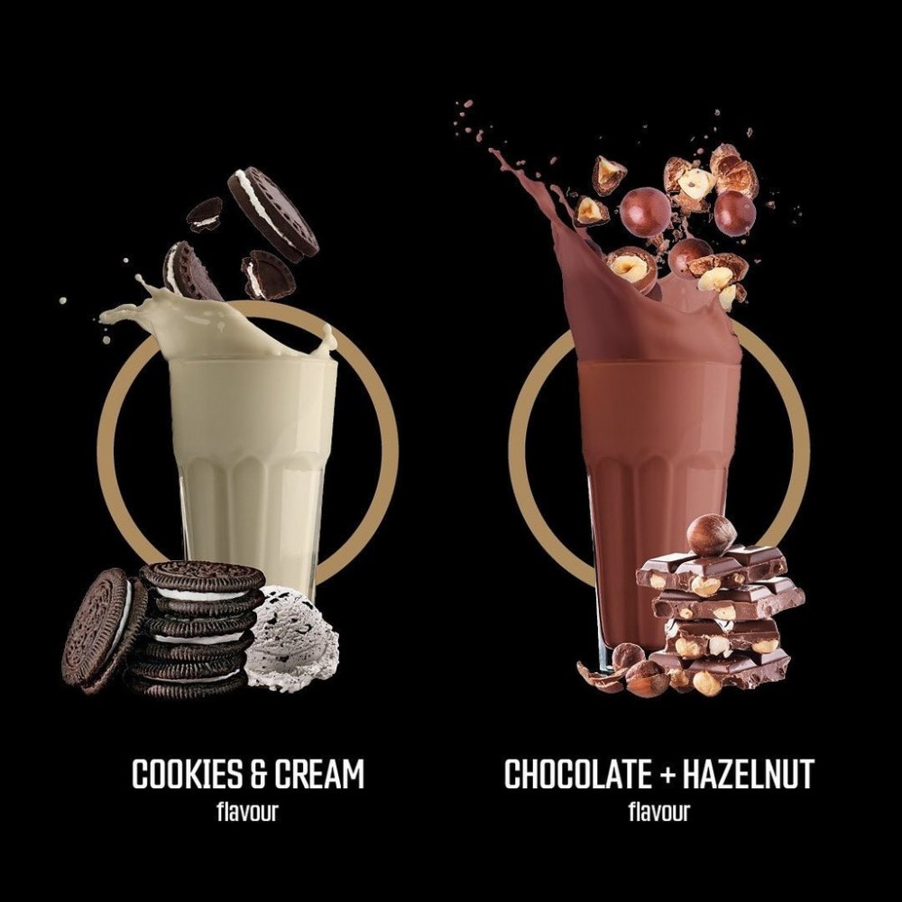 Cookies & cream: 80 % syrovátkový proteinový koncentrát (obsahuje slunečnicový lecitin a protispékavou látku fosforečnan vápenatý), 14,5 % syrovátkový proteinový izolát (obsahuje sójový lecitin), aroma, bezlepková pšeničná vláknina, stabilizátory akáciová a xanthanová guma, protispékavá látka oxid křemičitý, chlorid sodný, směs trávících enzymů Digezyme® (amyláza, proteáza, laktáza, lipáza a celuláza), sladidla sukralóza a steviol-glykosidy.