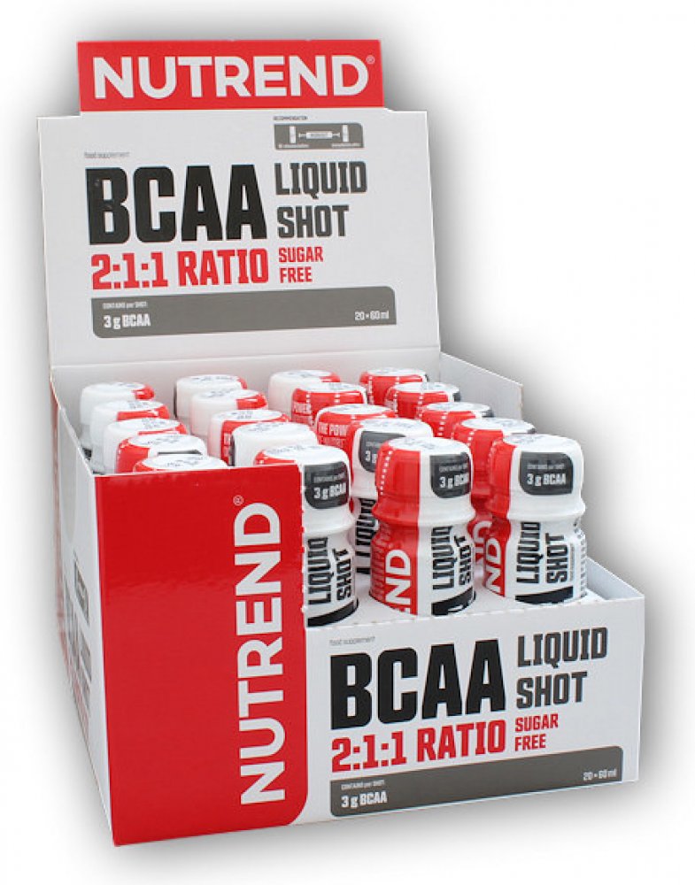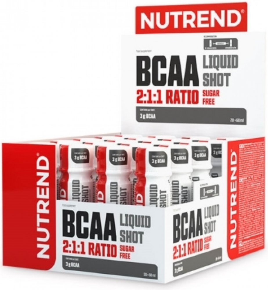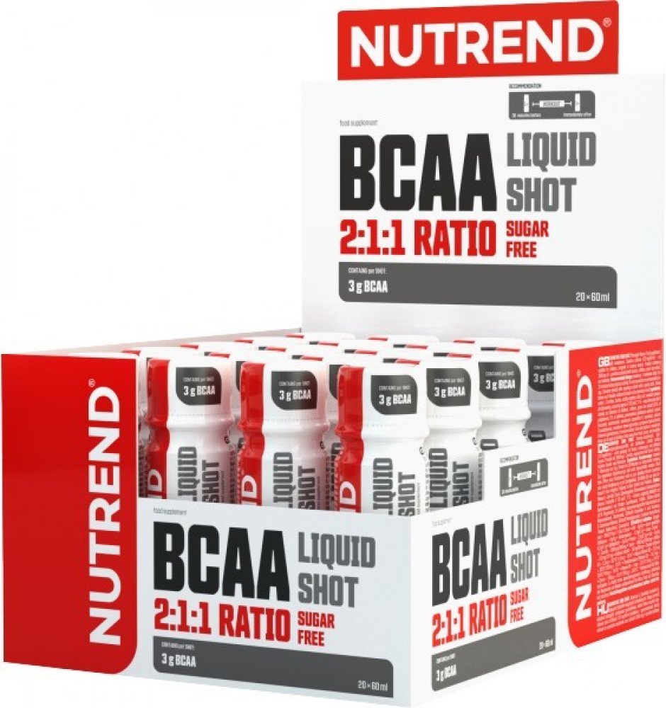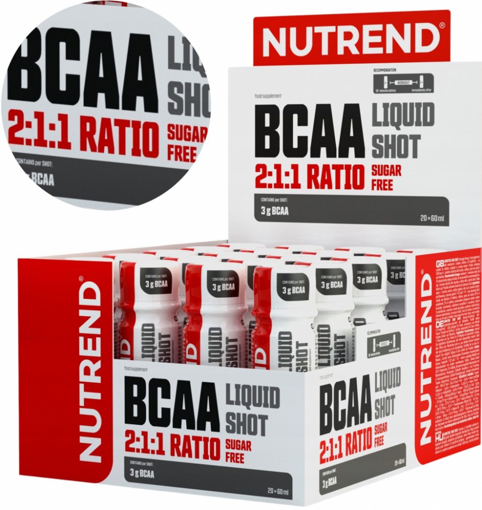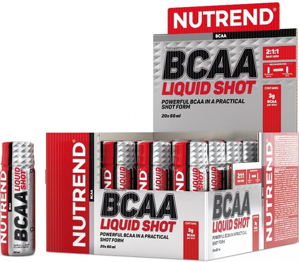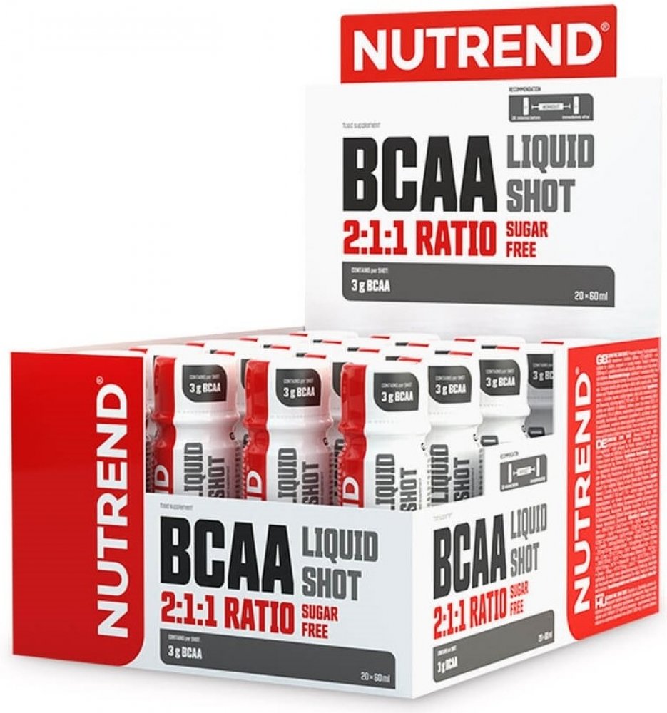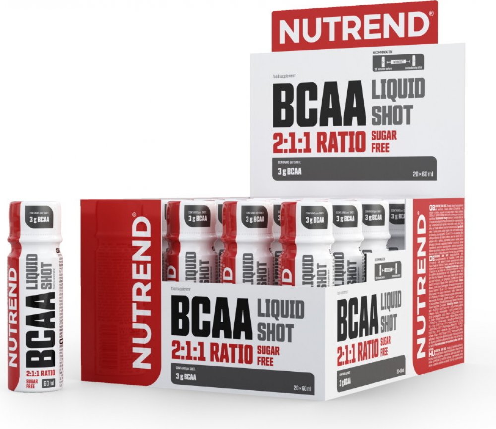 Esenciální větvené aminokyseliny L-leucin, L-isoleucin a L-valin (BCAA) v tekuté podobě, rozdělené do přesných dávek jednotlivých shotů. Tekutina představuje nejrychlejší možnost dodání aminokyselin a každý shot v sobě nese 3 g BCAA.