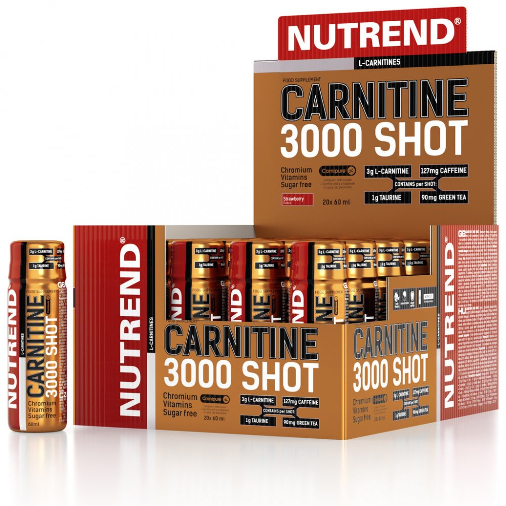 CARNITINE 3000 SHOT příchuť jahoda: voda, L-karnitin, taurin, regulátor kyselosti kyselina citronová, kofein, extrakt zeleného čaje (50 % polyfenolů, 8 % kofeinu), konzervanty sorban draselný a benzoan sodný, nikotinamid (vitamin B3), sladidlo acesulfam K, aroma, sladidlo sukralóza, D-pantotenát vápenatý (vitamin B5), sladidlo steviol-glykosidy, pyridoxin hydrochlorid (vitamin B6), thiamin hydrochlorid (vitamin B1), barvivo E 122 – může nepříznivě ovlivňovat činnost a pozornost dětí, mléčnan chromitý.