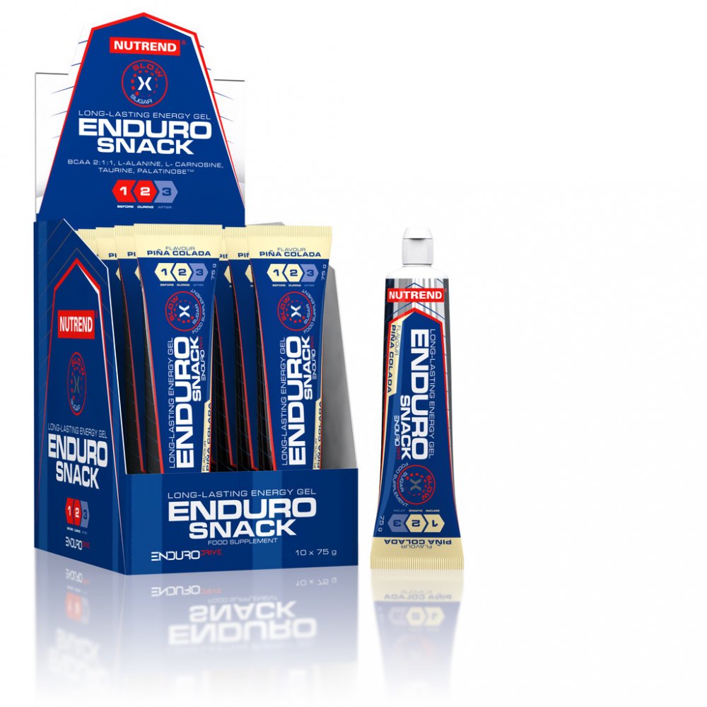 ENDUROSNACK GEL příchuť slaný karamel: voda, isomaltulóza - PalatinoseTM (je zdrojem fruktózy a glukózy), glukóza, zahušťovadlo xanthanová guma, taurin, glycin, L-leucin, L-alanin, regulátor kyselosti kyselina citrónová, chlorid sodný, regulátor kyselosti kyselina jablečná, L-isoleucin, L-valin, aroma, konzervanty benzoan sodný a kyselina sorbová, L-karnosin, sladidla acesulfam K a sukralóza.ENDUROSNACK příchuť pomeranč + kokos: voda, isomaltulóza - PalatinoseTM (je zdrojem fruktózy a glukózy), glukóza, zahušťovadlo xantanová guma, taurin, glycin, emulze oranž (slunečnicový olej, aroma, barviva E-160a, E-160e, E-161b), L-leucin, L-alanin, regulátory kyselosti kyselina citrónová a kyselina jablečná, L-isoleucin, L-valin, konzervanty benzoan sodný a kyselina sorbová, aroma, L-karnosin, sladidla acesulfam K a sukralóza.