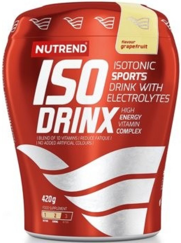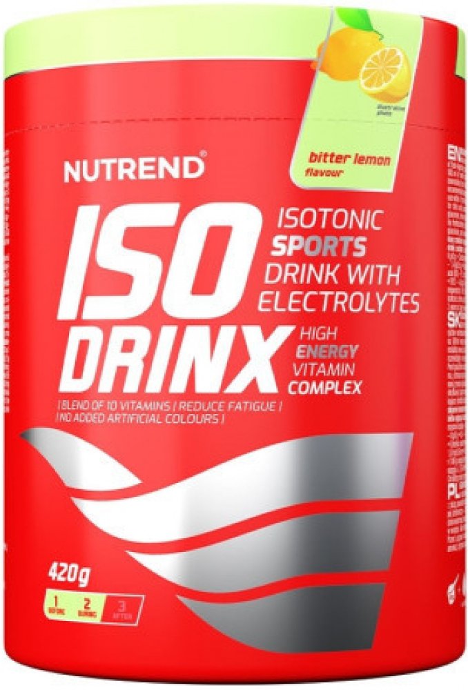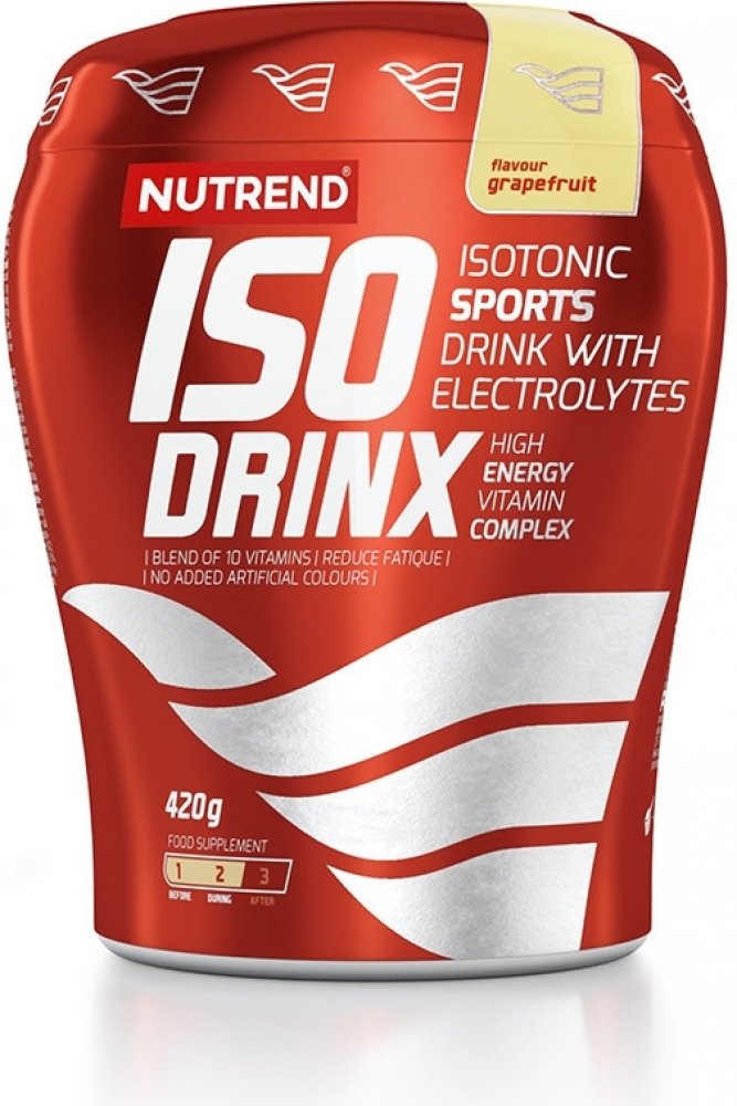 Energetický nápoj v sypké formě Nutrend Isodrinx 420g zajistí vašemu tělu kvalitní dávku energie pro fyzickou aktivitu. Je to ideální zdroj tekutin s optimálním množstvím minerálů a vitaminů. Profesionální sportovní nápoj v sypké formě Nutrend Isodrinx 420g představuje díky vysokému obsahu rychle vstřebatelných sacharidů a sodíku ideální zdroj tekutin s optimálním množstvím minerálů a vitaminů. Tento energetický nápoj je ideální z hlediska možnosti použití jak v hypotonickém, tak v isotonickém ředění. Složení je inspirováno nejmodernějšími výzkumy z oblasti fyziologie zátěže a sportovní výživy. Důraz je kladen zejména na požadavky lidského organismu v souvislosti s příjmem tekutin a minerálů v průběhu výkonu. Kvalitní pitný režim během zátěže napomáhá k rychlejší rehydrataci organismu a doplnění ztracených minerálů. Isodrinx současně dodává celé spektrum nezbytných vitaminů. Směs vitamínů a minerálů je zde v kombinaci s jednoduchými cukry (glukóza, sacharóza) a s komplexními sacharidy (maltodextrin), což zaručuje efekt dodání „rychlé“ i „pozvolné“ energie. Nápoj je v doporučeném množství určen pro každého jedince k běžnému doplnění tekutin a základních minerálů. Hypotonický nápoj užívejte v průběhu výkonu k hydrataci organismu, isotonický nápoj užívejte v průběhu výkonu pro doplnění energie a ztracených minerálů. Možno použít i před výkonem pro předzásobení sacharidy a minerály. Přednosti nápoje Isodrinx: efektivní hydratace organismu doplnění energie a podpora výkonnosti doplnění minerální rovnováhy během zátěže nebo před ní zvýšený obsah sacharidů - sacharidy 90%, z toho jednoduché cukry 84% optimální poměr minerálů minerály ve formě maximálně využitelné organismem isotonické i hypotonické ředění 5 příchutí Složení: pomeranč: sacharóza, glukóza, maltodextrin, aroma, regulátor kyselosti kyselina citronová, citronan sodný, stabilizátor karagenan, chlorid sodný, regulátor kyselosti kyselina jablečná, glukonát vápenatý, vitaminový premix (kyselina L-askorbová, DL-α-tokoferylacetát, nikotinamid, D-pantotenát vápenatý, pyridoxin hydrochlorid, riboflavin, thiamin mononitrát, kyselina pteroylmonoglutamová, D-biotin, kyanokobalamin), glukonát draselný, protispékavé látky fosforečnan vápenatý a oxid křemičitý, citronan hořečnatý, barvivo beta karoten. Výrobek může obsahovat stopy sóji a mléčné bílkoviny. zelené jablko: sacharóza, glukóza, maltodextrin, regulátor kyselosti kyselina citronová, aroma, citronan sodný, stabilizátor karagenan, chlorid sodný, regulátor kyselosti kyselina jablečná, glukonát vápenatý, vitaminový premix (kyselina L-askorbová, DL-α-tokoferylacetát, nikotinamid, D-pantotenát vápenatý, pyridoxin hydrochlorid, riboflavin, thiamin mononitrát, kyselina pteroylmonoglutamová, D-biotin, kyanokobalamin), glukonát draselný, protispékavé látky fosforečnan vápenatý a oxid křemičitý, citronan hořečnatý. Výrobek může obsahovat stopy sóji a mléčné bílkoviny. bitter lemon: sacharóza, glukóza, maltodextrin, regulátor kyselosti kyselina citronová, aroma, citronan sodný, stabilizátor karagenan, chlorid sodný, regulátor kyselosti kyselina jablečná, glukonát vápenatý, vitaminový premix (kyselina L-askorbová, DL-α-tokoferylacetát, nikotinamid, D-pantotenát vápenatý, pyridoxin hydrochlorid, riboflavin, thiamin mononitrát, kyselina pteroylmonoglutamová, D-biotin, kyanokobalamin), glukonát draselný, protispékavé látky fosforečnan vápenatý a oxid křemičitý, citronan hořečnatý, aroma naringin. Výrobek může obsahovat stopy sóji a mléčné bílkoviny. černý rybíz: sacharóza, glukóza, maltodextrin, regulátor kyselosti kyselina citronová, aroma, citronan sodný, stabilizátor karagenan, chlorid sodný, regulátor kyselosti kyselina jablečná, glukonát vápenatý, vitaminový premix (kyselina L-askorbová, DL-α-tokoferylacetát, nikotinamid, D-pantotenát vápenatý, pyridoxin hydrochlorid, riboflavin, thiamin mononitrát, kyselina pteroylmonoglutamová, D-biotin, kyanokobalamin), glukonát draselný, protispékavá látka fosforečnan vápenatý,směs koncentrátu z červené řepy a extraktu spiruliny, protispékavá látka oxid křemičitý, koncentrát z černé mrkve, citronan hořečnatý. Výrobek může obsahovat stopy sóji a mléčné bílkoviny. grep: sacharóza, glukóza, maltodextrin, aroma, regulátor kyselosti kyselina citronová, citronan sodný, stabilizátor karagenan, chlorid sodný, regulátor kyselosti kyselina jablečná, glukonát vápenatý, vitaminový premix (kyselina L-askorbová, DL-α-tokoferylacetát, nikotinamid, D-pantotenát vápenatý, pyridoxin hydrochlorid, riboflavin, thiamin mononitrát, kyselina pteroylmonoglutamová, D-biotin, kyanokobalamin), glukonát draselný, protispékavé látky fosforečnan vápenatý a oxid křemičitý, citronan hořečnatý, aroma naringin. Výrobek může obsahovat stopy sóji a mléčné bílkoviny. Tabulka nutričních hodnot: ISODRINX nutriční hodnoty 100 g Dávka 35 g = 500 ml isotonického nápojeDávka 35 g = 750 ml hypotonického nápoje Energetická hodnota 1582 kJ/372 kcal 554 kJ/ 130 kcal Tuky 0 g 0 g z toho nasycené mastné kyseliny 0 g 0 g Sacharidy 90 g 31,5 g z toho cukry 83,6 g 29,3 g Vláknina 0 g 0 g Bílkoviny 0 g 0 g Sůl 1,4 g 0,5 g Vitamin C 129,2 mg 45,2 mg Niacin (Vitamin B3) 25,8 mg 9,0 mg Vitamin E 19,4 mg 6,8 mg Kyselina pantotenová (Vitamin B5) 9,7 mg 3,4 mg Vitamin B6 2,3 mg 0,8 mg Riboflavin (Vitamin B2) 2,3 mg 0,8 mg Thiamin (Vitamin B1) 1,8 mg 0,6 mg Vitamin B12 4,0 µg 1,4 µg Biotin 80,7 µg 28,3 µg Kyselina listová 322,9 µg 113,0 µg obsah mírně navršené odměrky: cca 35 g obsah vitaminů ve 100 g odpovídá 161,5 % RHP obsah vitaminů ve 35 g odpo