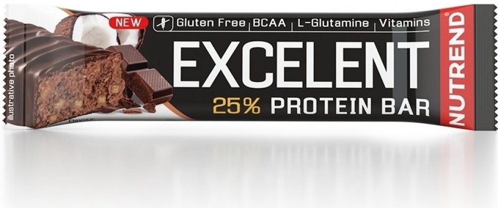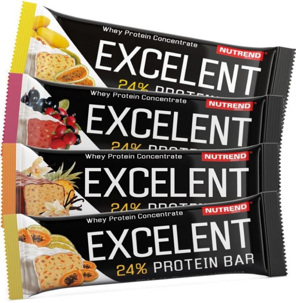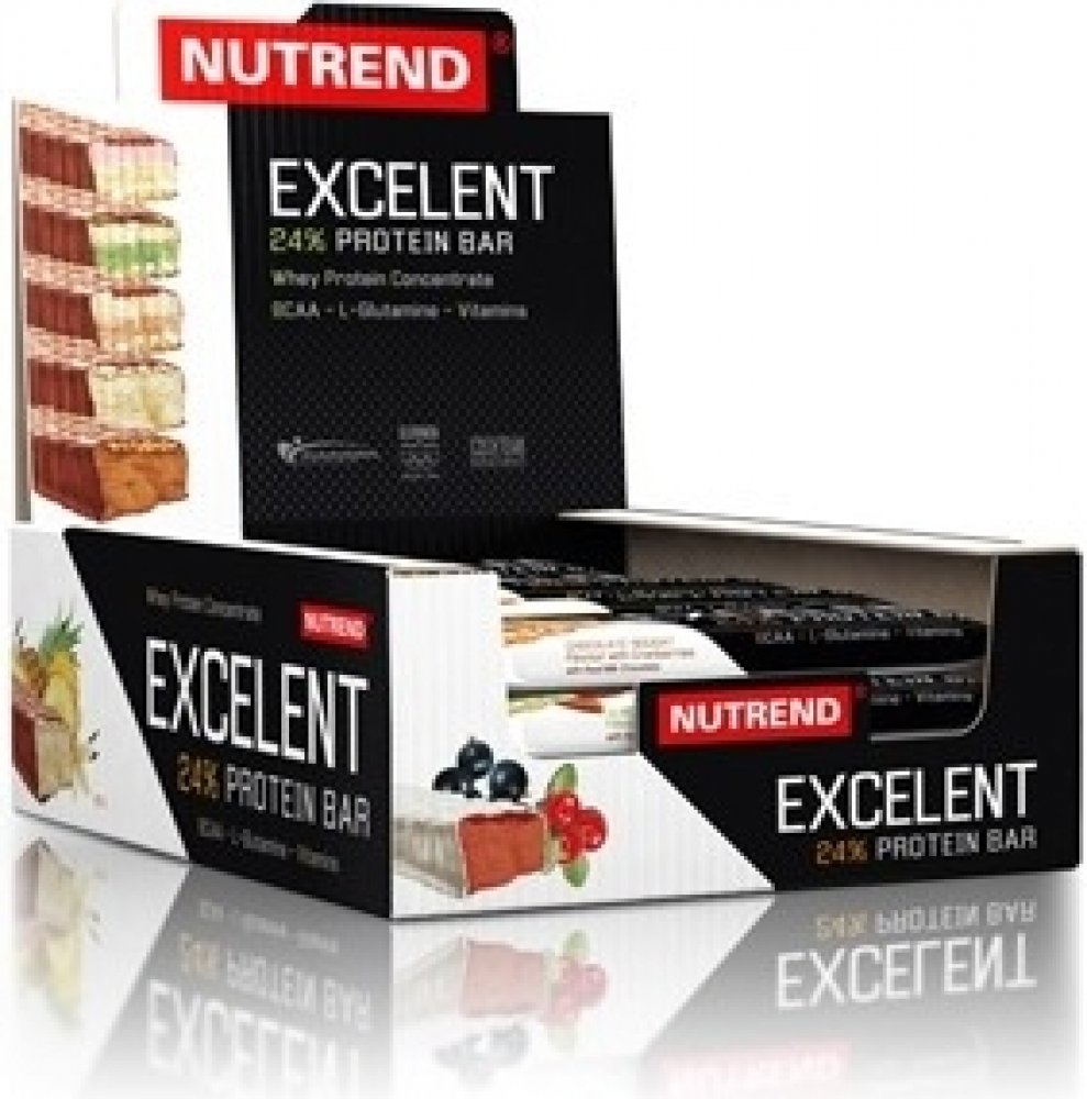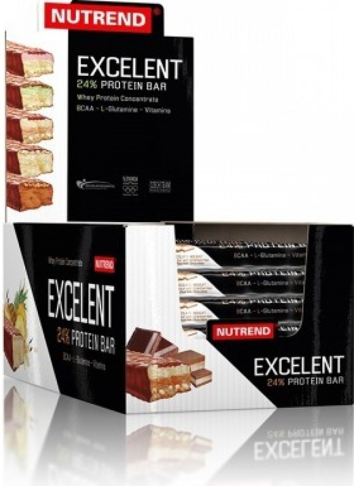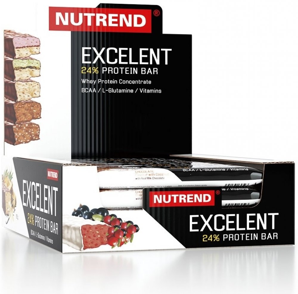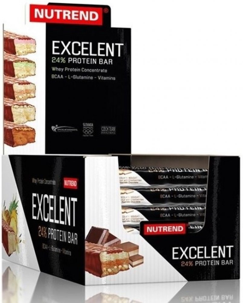 Proteinová tyčinka EXCELENT je bohatě posypaná ovocem či oříšky, zalitá v čokoládové nebo jogurtové polevě. Obsahuje 24% bílkovin, 43% sacharidů, dále větvené aminokyseliny (BCAA) a neesenciální aminokyselinu L-glutamin.