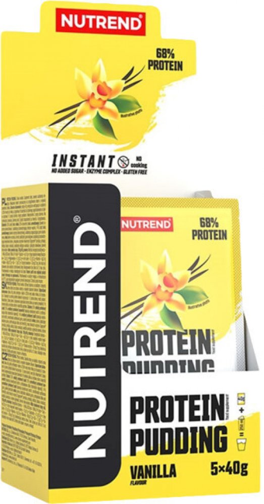 PROTEIN PUDDING příchuť vanilka: 35 % mléčný proteinový izolát, 35 % syrovátkový proteinový koncentrát (obsahuje slunečnicový lecitin a protispékavou látku fosforečnan vápenatý), 14 % syrovátkový proteinový izolát (obsahuje slunečnicový lecitin), zahušťovadlo xanthanová guma, sušené plnotučné mléko, aroma, stabilizátor akáciová guma, protispékavá látka oxid křemičitý, směs trávicích enzymů Digezyme® (amyláza, proteáza, laktáza, lipáza a celuláza), sladidla sukralóza a steviol-glykosidy, barvivo beta-karoten. Může obsahovat stopy sóji.