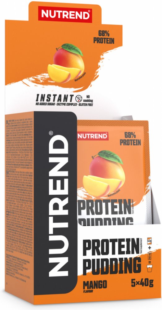 PROTEIN PUDDING příchuť mango: 35 % mléčný proteinový izolát, 35 % syrovátkový proteinový koncentrát (obsahuje slunečnicový lecitin a protispékavou látku fosforečnan vápenatý), 14,5 % syrovátkový proteinový izolát (obsahuje slunečnicový lecitin), zahušťovadlo xanthanová guma, sušené plnotučné mléko, aroma, stabilizátor akáciová guma, regulátor kyselosti kyselina citronová, protispékavá látka oxid křemičitý, směs trávicích enzymů Digezyme® (amyláza, proteáza, laktáza, lipáza a celuláza), sladidla sukralóza a steviol-glykosidy, barvivo beta-karoten. Může obsahovat stopy sóji.