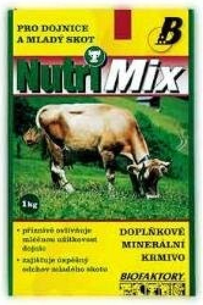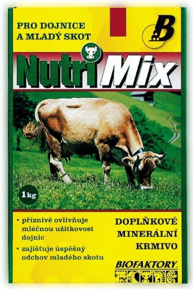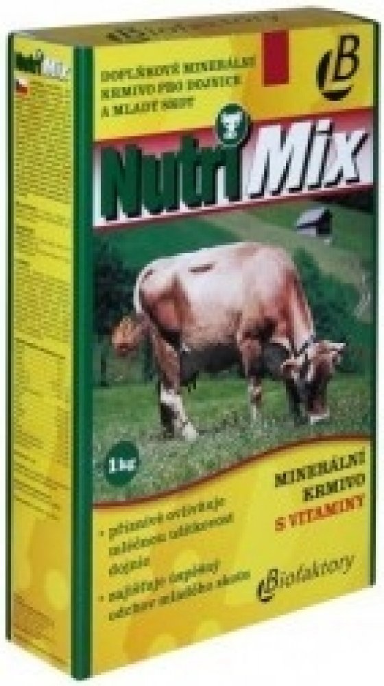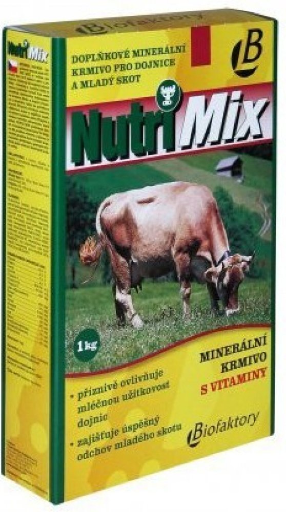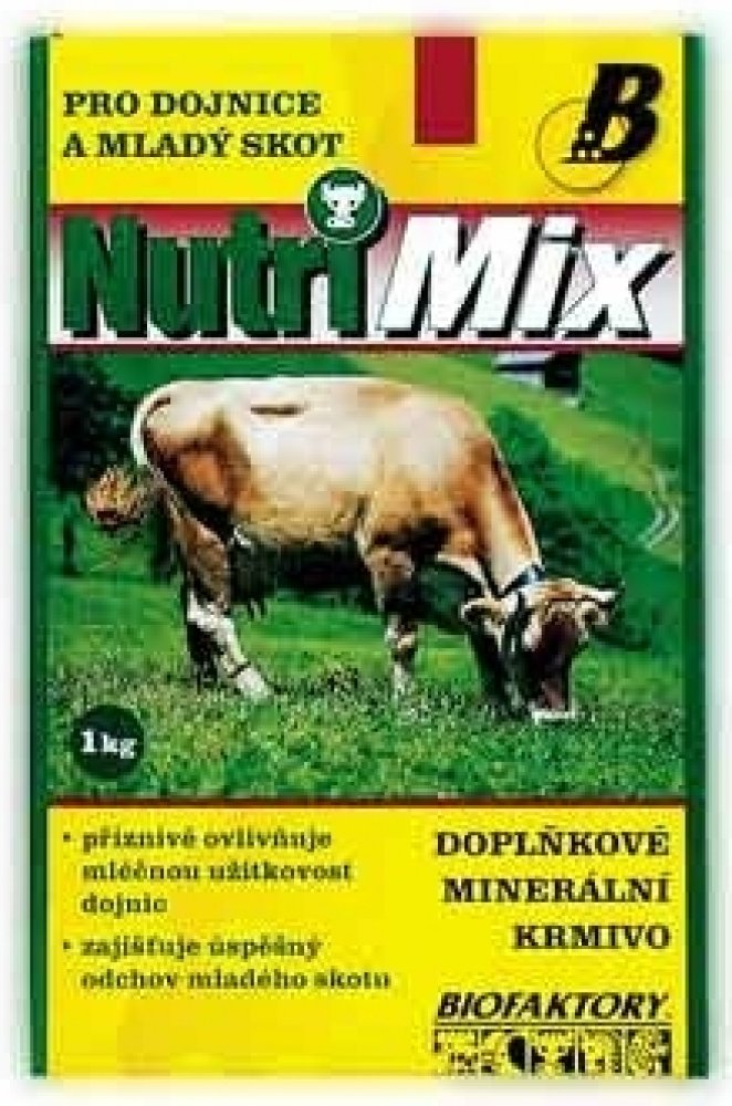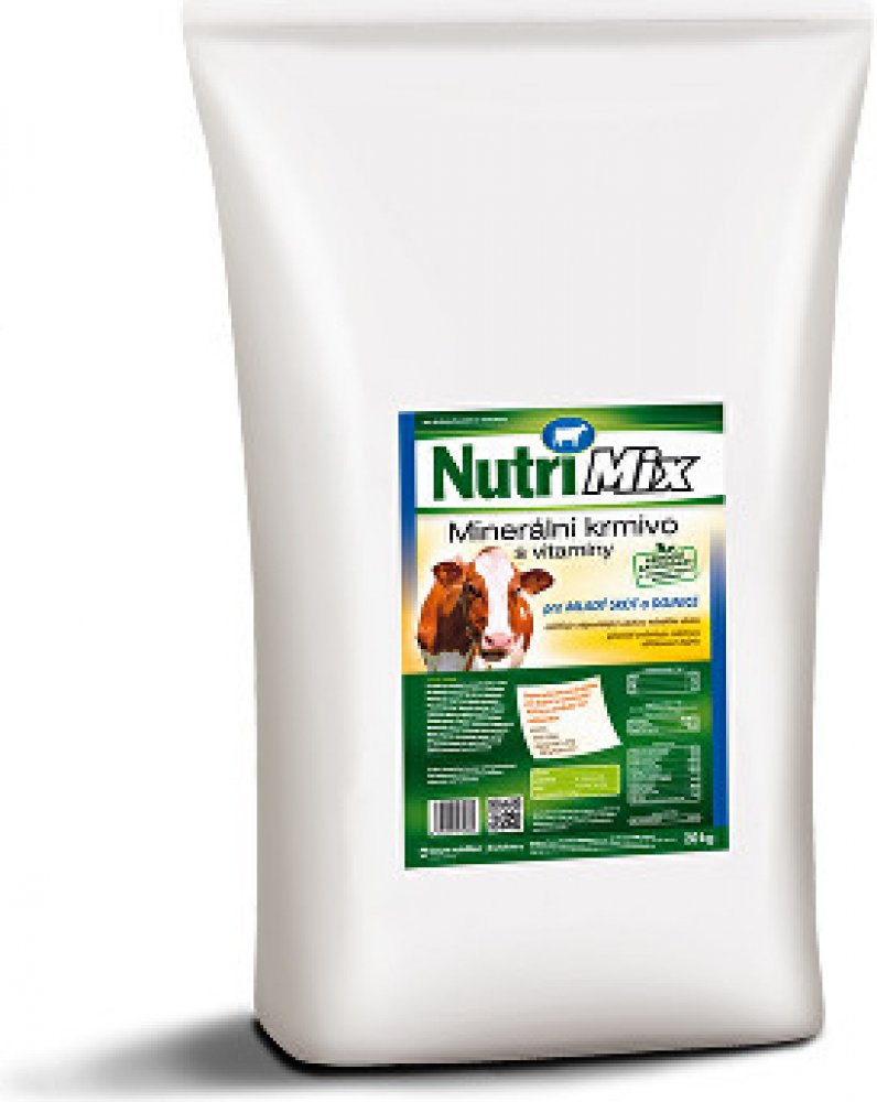 Krmný návod: Vitamino-minerální směs NUTRI MIX je určena pro mladý skot od 6 měsíců stáří a pro dojnice. Obsahuje biologicky účinné látky – vitamíny a minerální látky ve vysoce využitelné formě. Tato směs umožňuje chovatelům dokompletovat krmnou dávku a doplnit vitamíny a minerální látky na potřebnou úroveň. Příznivě ovlivňuje mléčnou užitkovost dojnic a zajišťuje úspěšný odchov mladého skotu. Přispívá k udržení dobrého zdravotního stavu zvířat.