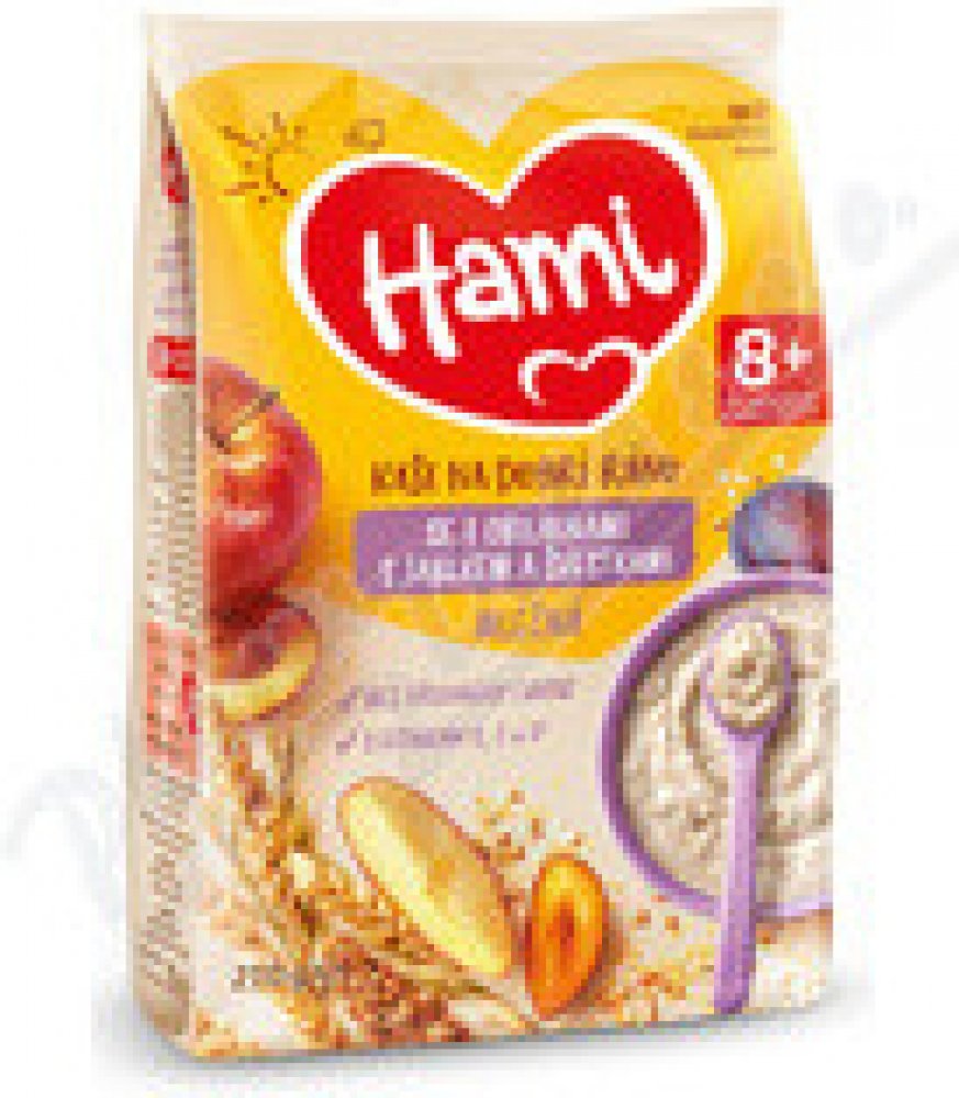 Hami Mléčná kaše na dobré ráno se 7obilninami s jablkem a švestkami 210g je obilný příkrm pro kojence a malé děti od ukončeného 8. měsíce věku. Potravina pro zvláštní výživu pro kojence a malé děti.