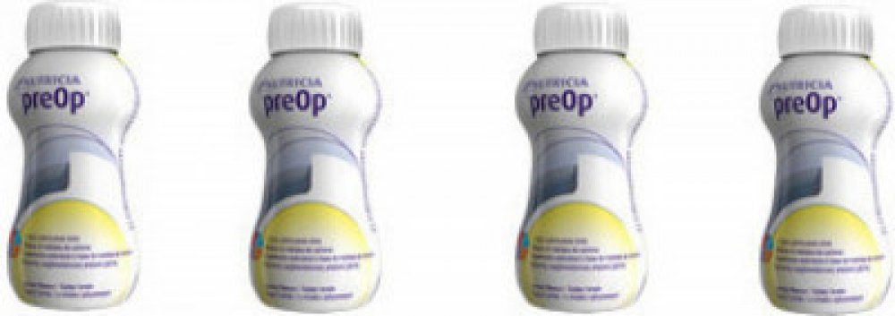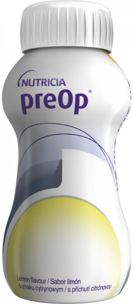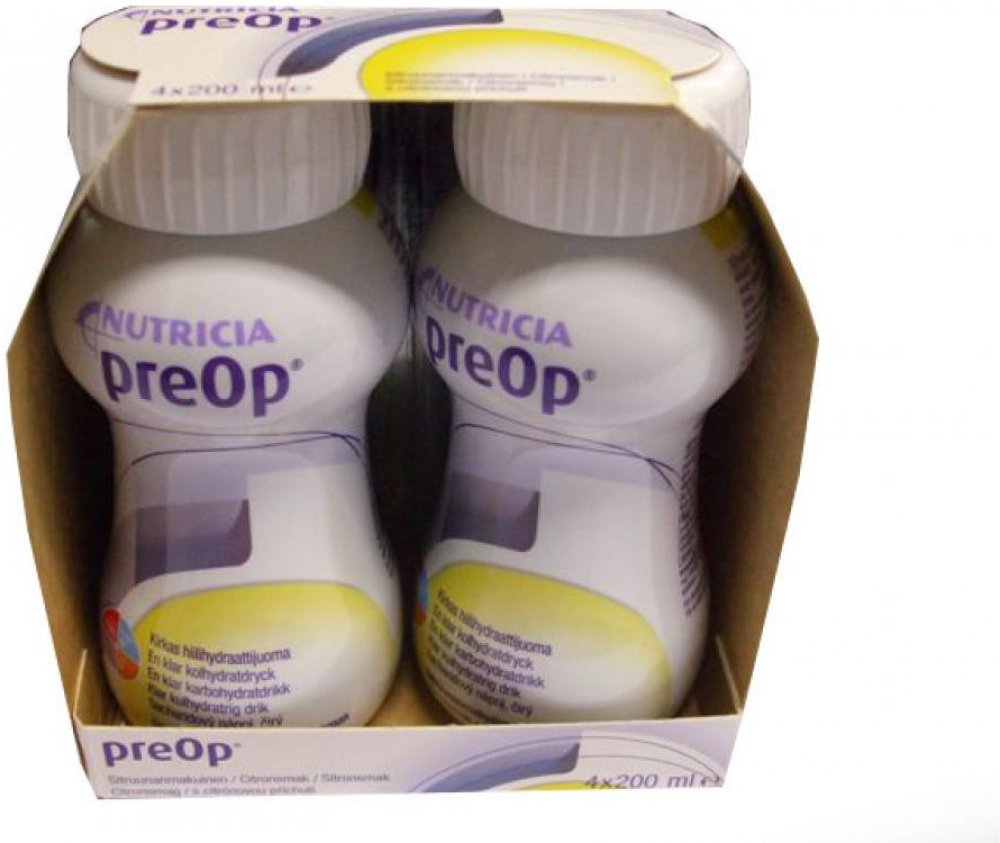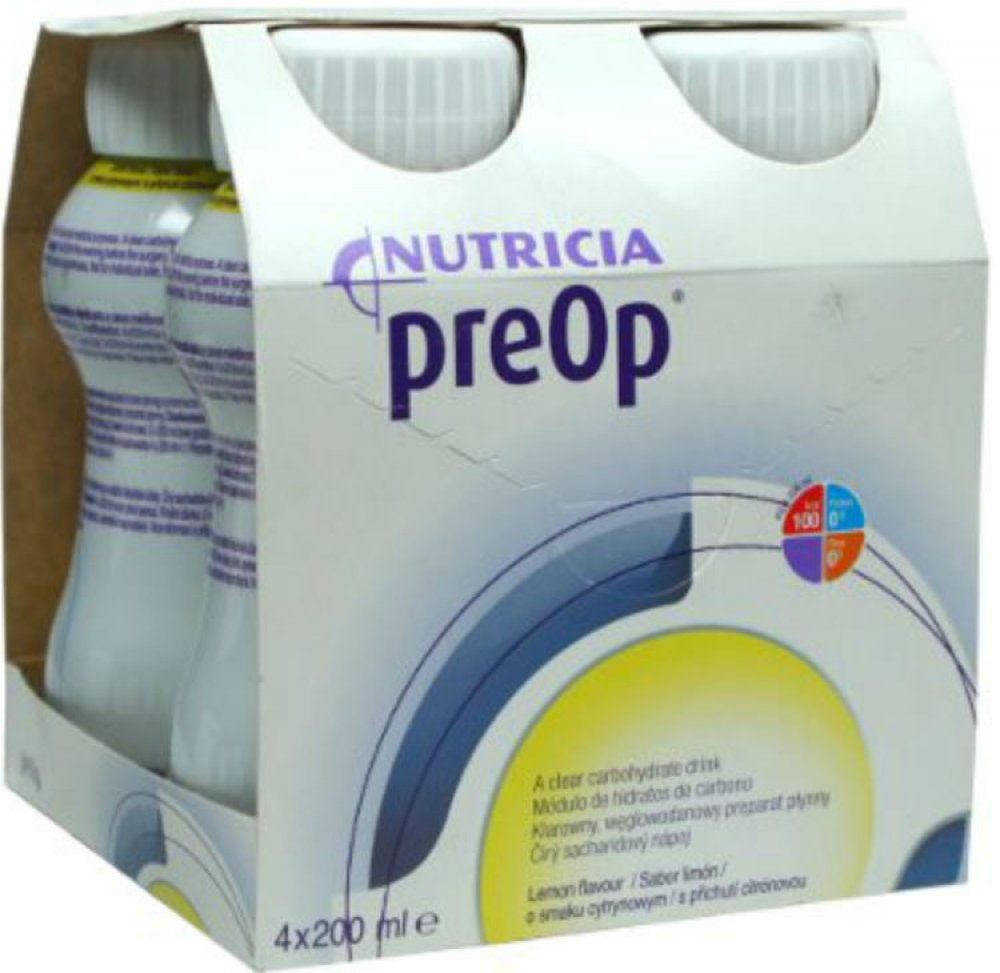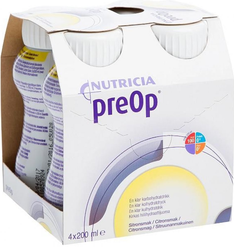 PreOp 4x200ml Dietní potravina pro zvláštní lékařské účely. Sacharidový isotonický nápoj s citrónovou příchutí, s přírodním sladidlem a sladidlem. Bez lepku. S nízkým obsahem laktózy. Bez vlákniny. Určeno k dietnímu postupu při přípravě na chirurgický výkon.