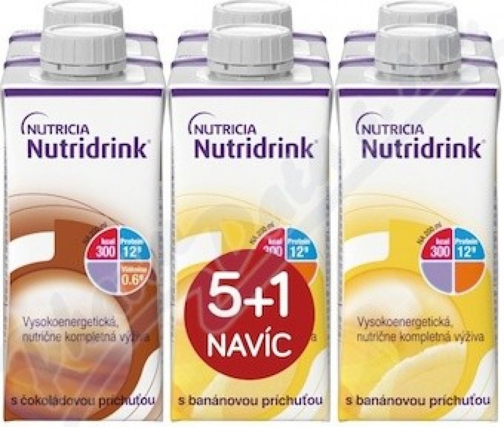 Kvalitní NUTRIDRINK BALICEK 5+1 (COKOLADA-BANAN) 6X200ML za 296.1 Kč. Nutridrink balíček 5+1 (čokoláda-banán) je potravina pro zvláštní lékařské účely. Vysokoenergetická nutričně kompletní tekutá výživa pro řízenou dietní výživu při podvýživě související s nemocí. Vhodné jako jediný zdroj výživy. Při podávání dětem ve věku od 3 do 6 let je nutno dbát zvýšené opatrnosti.