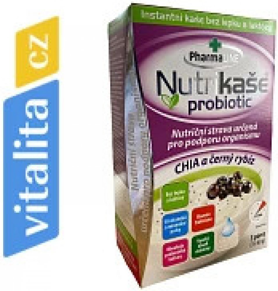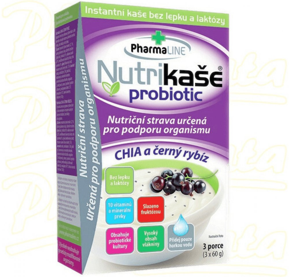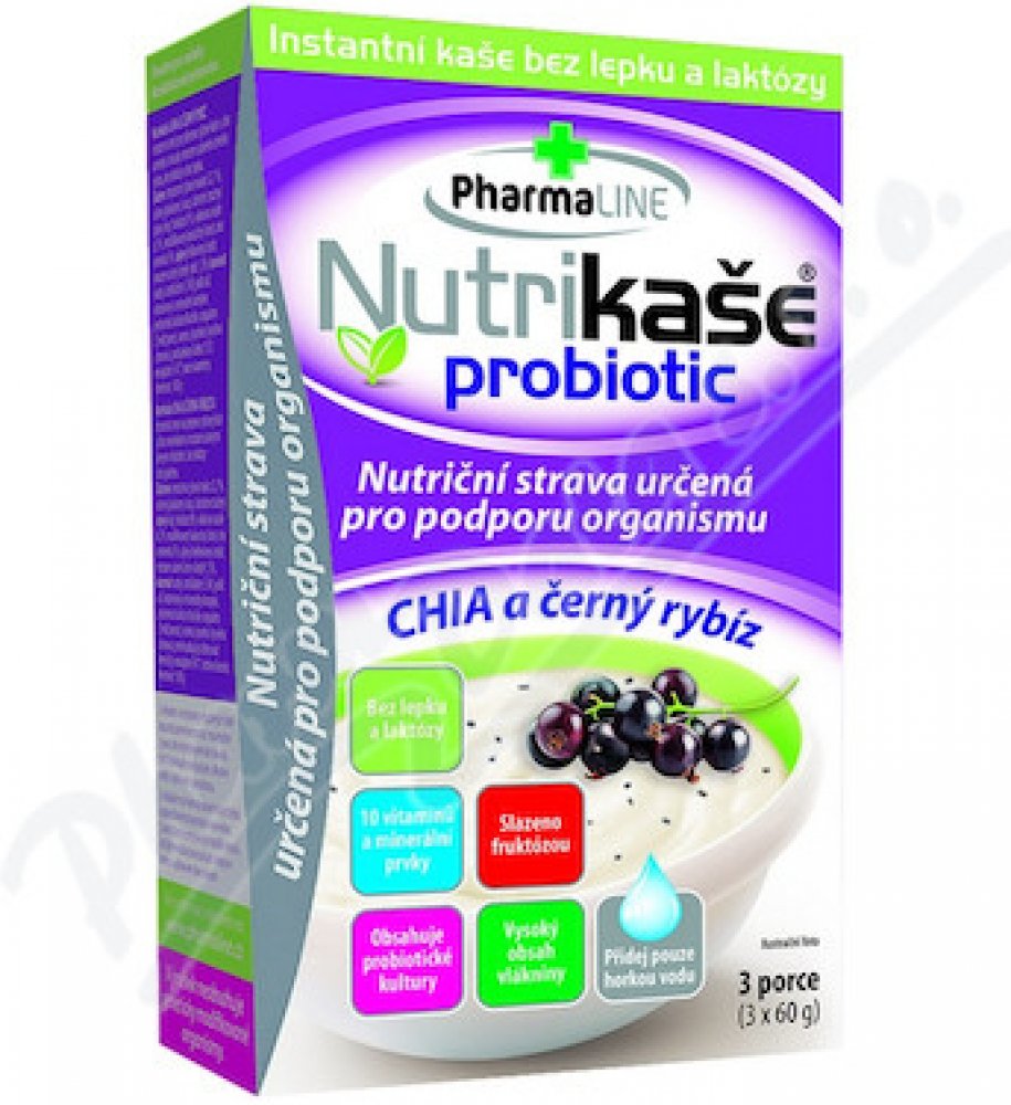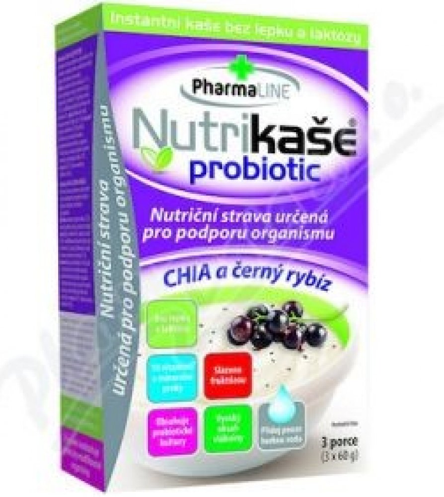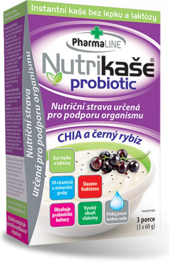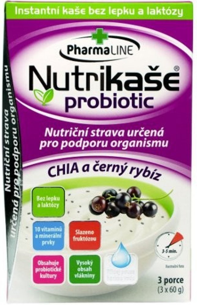 Nutriční strava pro podporu organismu, bez lepku a laktózy, s obsahem 10 vitamínů, vlákniny a probiotických kultur. Vhodné pro osoby s bezlepkovou dietou a laktózovou intolerancí. K přislazení je používán ovocný cukr - monosacharid fruktóza. Nutrikaše obsahuje 5 % chia semínek. Přidané kousky černého rybízu jsou lyofilizovány - sušeny hlubokým mrazem...