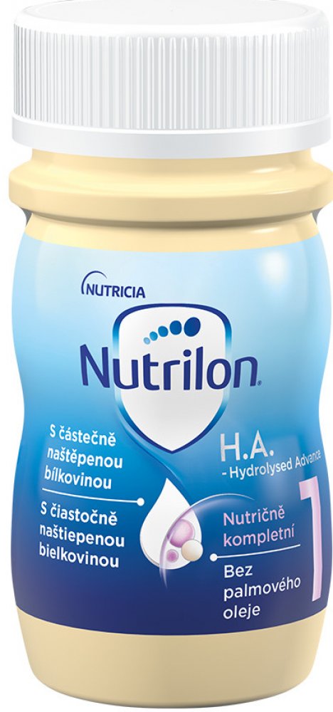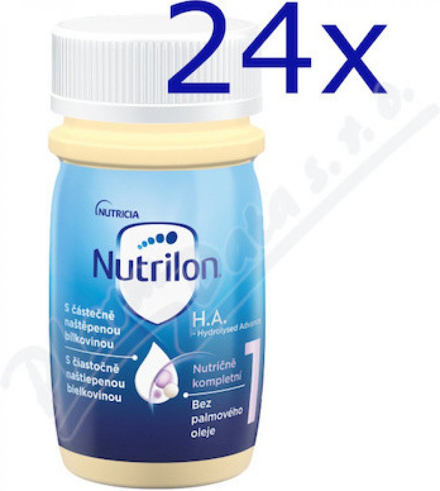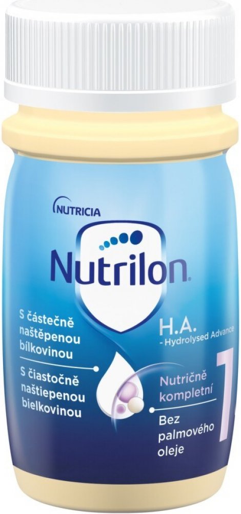 Nutrilon 1 H.A. RTF je potravina pro zvláštní lékařské účely. Tato hypoalergenní počáteční mléčná kojenecká tekutá výživa je ošetřená UHT. Je vyvinutá speciálně pro miminka, která nemohou být kojena, případně musí být přikrmována, s částečně naštěpenou bílkovinou.Vhodná od narození.Výživa se používá jen na základě doporučení lékaře nebo osoby kvalifikované v oblasti výživy lidí, farmacie nebo péče o matku a dítě. Pro zdraví kojenců je důležité důsledné dodržování návodu na přípravu i uvedených doporučení.Balení obsahuje 24x90 ml.