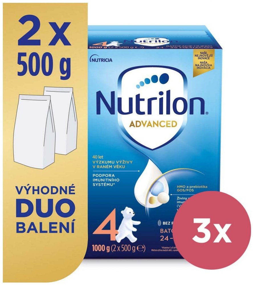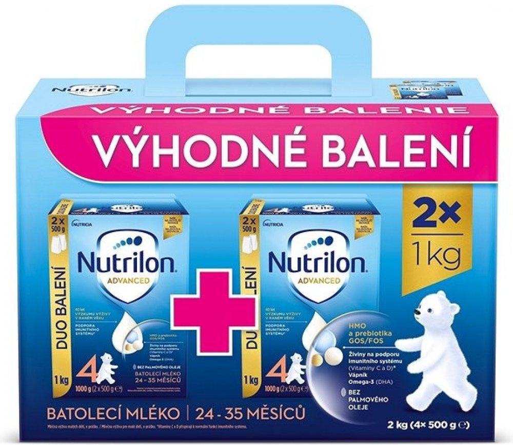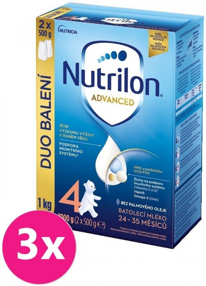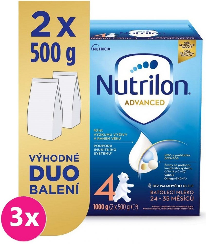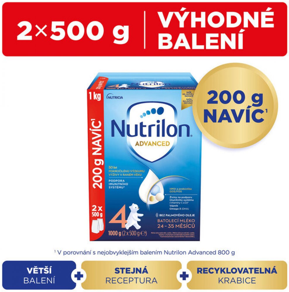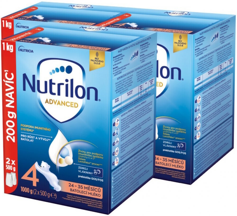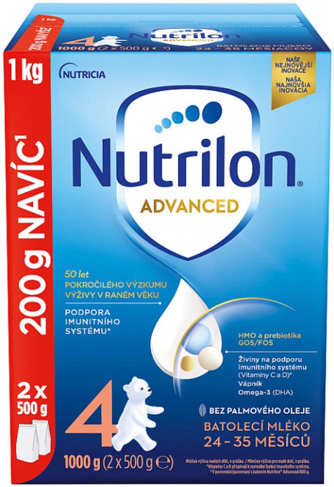 Objevte naši nejnovější inovaci mlék Nutrilon 4 Advanced, speciálně vyvinutou pro PODPORU IMUNITNÍHO SYSTÉMU A NORMÁLNÍHO VÝVOJE*. Naše jedinečné složení obsahuje naši patentovanou směs PREBIOTIK GOS/FOS a LCP**, oligosacharid mateřského mléka 3´GL (3´galaktosyllaktóza), který přináší náš unikátní proces výroby, vitamíny C a D, které přispívají k podpoře imunity* a tak vápník potřebný pro normální růst a vývin kostí u dětí. Naše inovovaná receptura je BEZ PALMOVÉHO OLEJE a také nově v cenově výhodném a 100% recyklovatelném DUO balení!