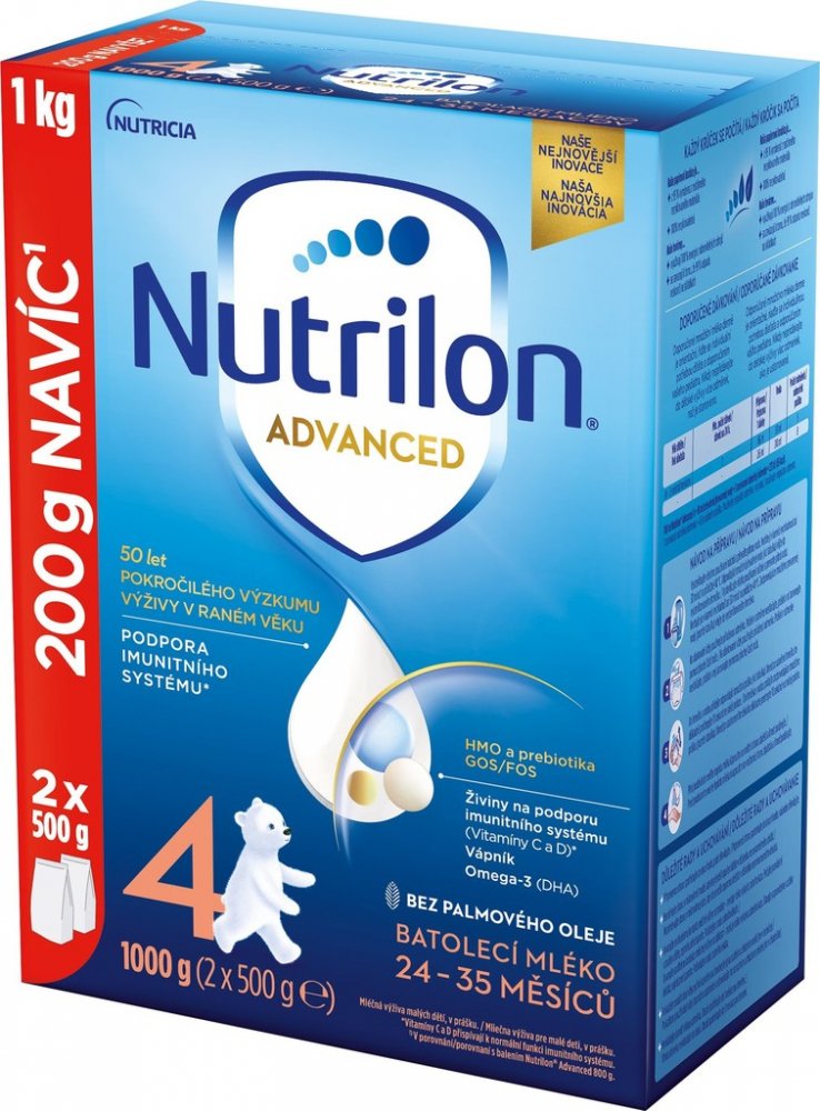 Nutrilon 4 Advanced má být součástí smíšené a vyvážené stravy dítěte a není náhradou mateřského mléka. Pro zdraví dětí je důležité důsledné dodržování návodu na přípravu i uvedených doporučení. Nevhodné pro děti do 1 roku věku.