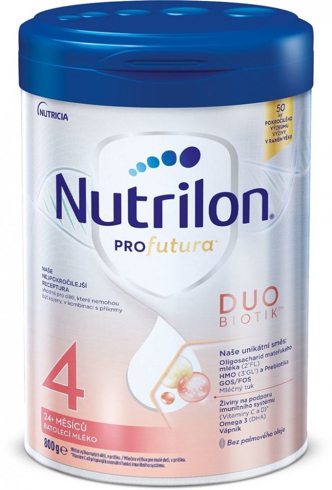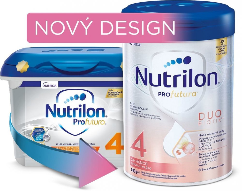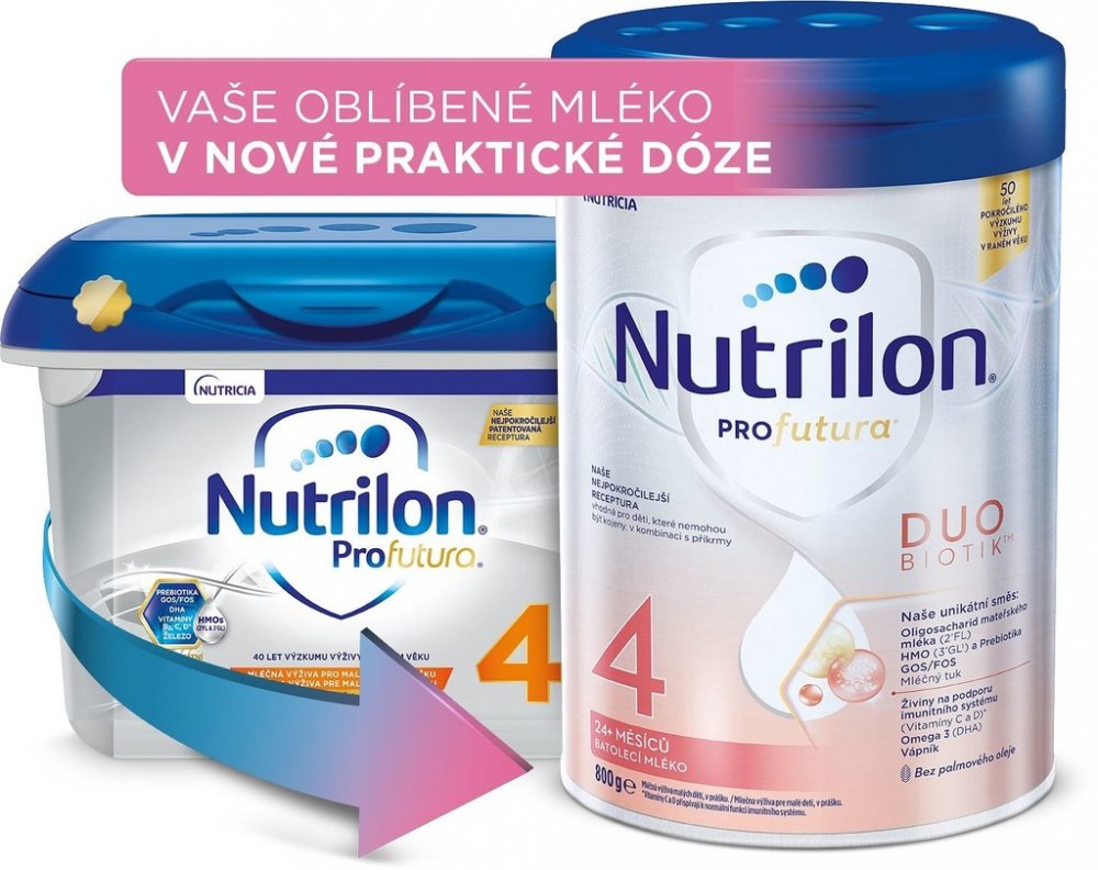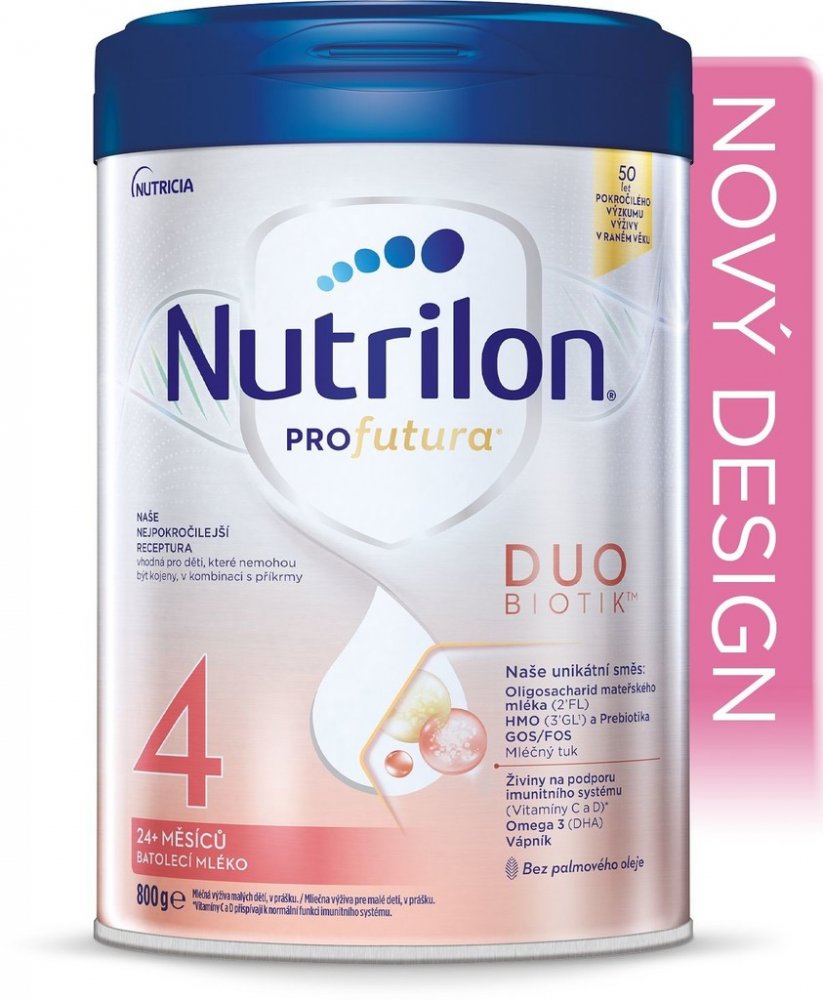 Objevte patentovanou recepturu batolecích mlék Nutrilon 4 Profutura s nejvyšším množstvím HMOs – oligosacharidů přirozeně se vyskytujících v mateřském mléce. Oligosacharidy mateřského mléka jsou třetí nejvýznamnější složkou mateřského mléka. Výživa obsahuje směs prebiotik GOS/FOS a mléčného tuku a vitamíny přispívající ke správné funkci imunitního systému. Nutrilon 4 Profutura nabízí zcela originální obal a také nejmodernější a zcela unikátní intuitivní design vytvořený ve spolupráci s rodiči. Praktické balení nabízí novou odměrku pro snazší manipulaci, bezpečné oboustranné uložení, eliminuje tak nežádoucí kontakt s obsahem.