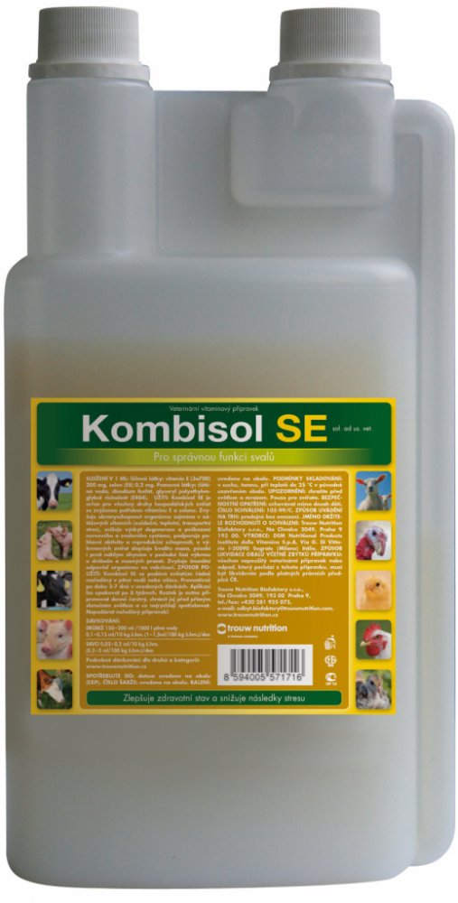 Podrobný popis Kombisol SE je přípravek pro správnou funkci svalů. V České republice je dlouhodobě pozorována nízká hladina selenu v krmných surovinách, což v kombinaci s intenzivním růstem nebo vysokou užitkovostí zvyšuje nároky na jeho doplnění do krmné dávky spolu s vitaminem E. Benefity: Snižuje výskyt degenerace a poškození nervového a svalového systému Zvyšuje obranyschopnost organismu zejména v zátěžových situacích Zlepšuje kvalitu masa u výkrmových zvířat Podporuje pohlavní aktivitu a reprodukční schopnosti Působí i proti náhlým úhynům v poslední fázi výkrmu u drůbeže a masných prasat Zvyšuje imunitní odpověď organismu na vakcinaci Aplikace: Kombisol SE se podává zvířatům řádně rozředěný v pitné vodě nebo mléce. Preventivně po dobu 3 – 7 dnů v uvedených dávkách. Aplikaci lze opakovat po 8 týdnech. Roztok je nutno připravovat denně čerstvý, chránit před přímým slunečním světlem a co nejrychleji spotřebovat. Nikdy nepodávejte přípravek neředěný! Dávkování: DRŮBEŽ 200 – 300 ml / 1000 l pitné vody ml/1000 ks ml/10 kg ž. hm. ml/100 kg ž. hm. mladá drůbež do 3 týdnů stáří 10 - 30 0,3 3 výkrm a odchov drůbeže nad 3 týdny stáří 30 - 60 0,2 - 0,3 2 - 3 dospělá hrabavá drůbež (slepice, bažant, perlička, křepelka, koroptev, aj.) 50 0,25 2,5 krůta 100 0,2 2 dospělá vodní drůbež (husy, kachny) 60 0,2 2 SAVCI ml/ ks ml/10 kg ž. hm. ml/100 kg ž. hm. sele, jehně, kůzle (5 kg) 0,1 0,2 2 tele, hříbě (150 kg) 1,5 0,1 1 prase (80 kg) 0,4 0,05 0,5 kůň (500 kg) 2 0,04 0,4 králík, nutrie (4 kg) 0,1 0,2 2 pes, kočka (5 kg) 0,2 0,4 4 morče, drobní hlodavci (0,5 kg) 0,2 2 Složení v 1 ml: Vitamin E 200 mg, selen 0,2 mg. Balení: 1000 ml Datum spotřeby: 18 měsíců od data výroby